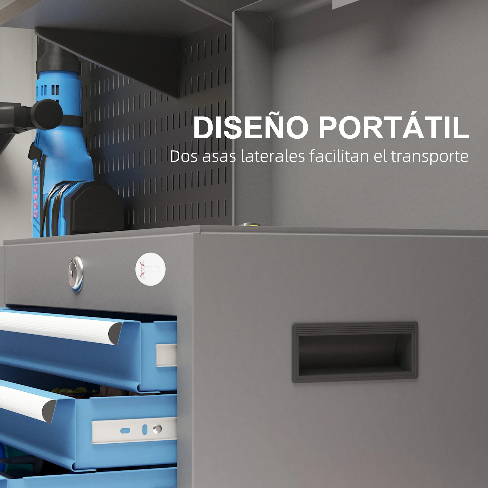 - Maletín de herramientas con 1 candado y 2 llaves para bloquear todos los cajones y el estante superior, asegurando la confidencialidad y la seguridad de tus artículos;