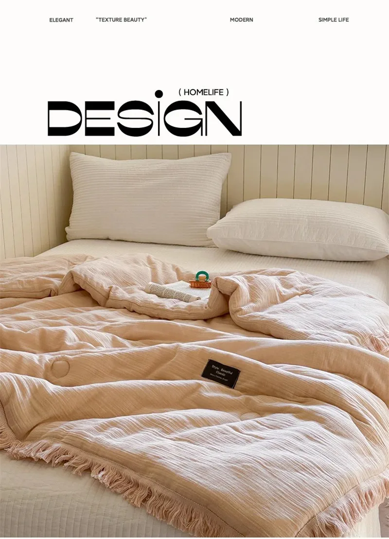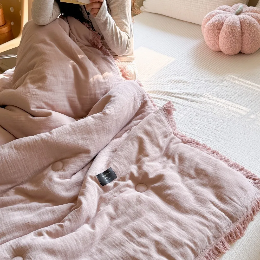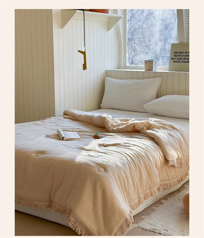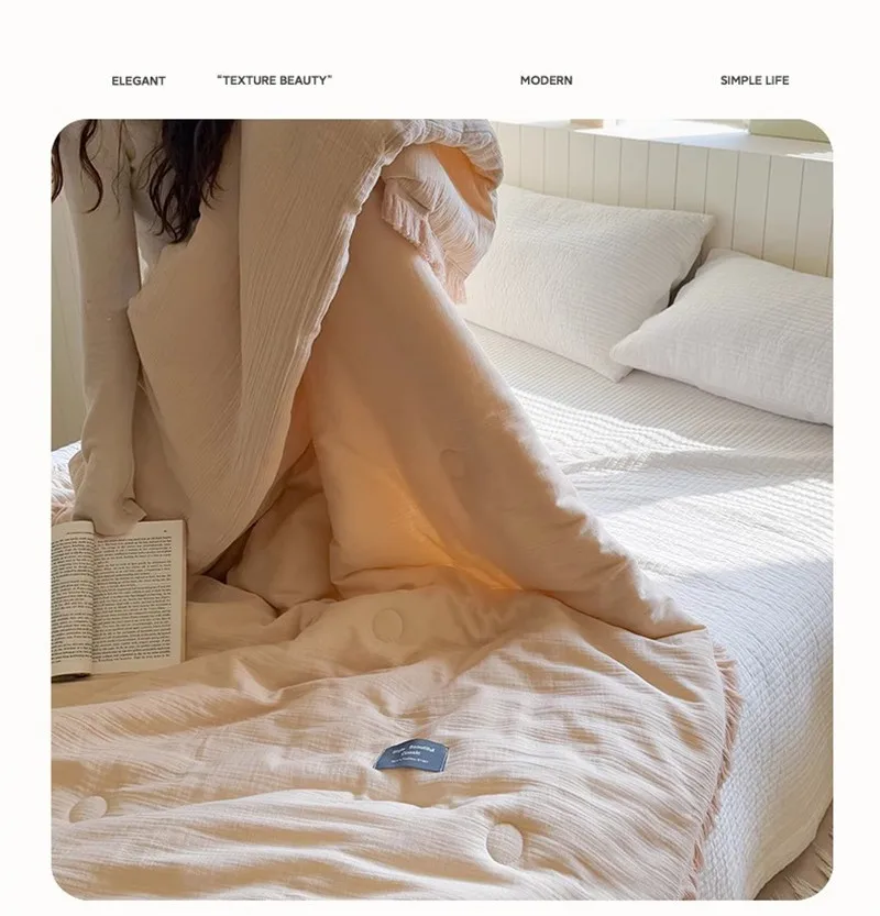 Edredón de verano de gasa de algodón de gasa de cuatro capas de fibra de clase A, hilo arrugado, relleno de fibra de soja, aire acondicionado, edredón fino lavable