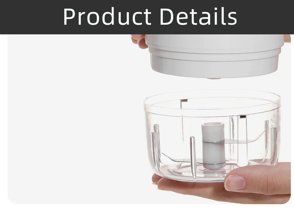 Este es un dispositivo multifunción, podría ser una picadora, picadora, cortadora, trituradora, trituradora, picadora o procesador de alimentos. Lo que sea, podría procesar muchos ingredientes como ajo, jengibre, Chile, cebollas, verduras, algunos tipos de nueces, incluso pequeños trozos de carne. Libere sus manos y ahorre tiempo.