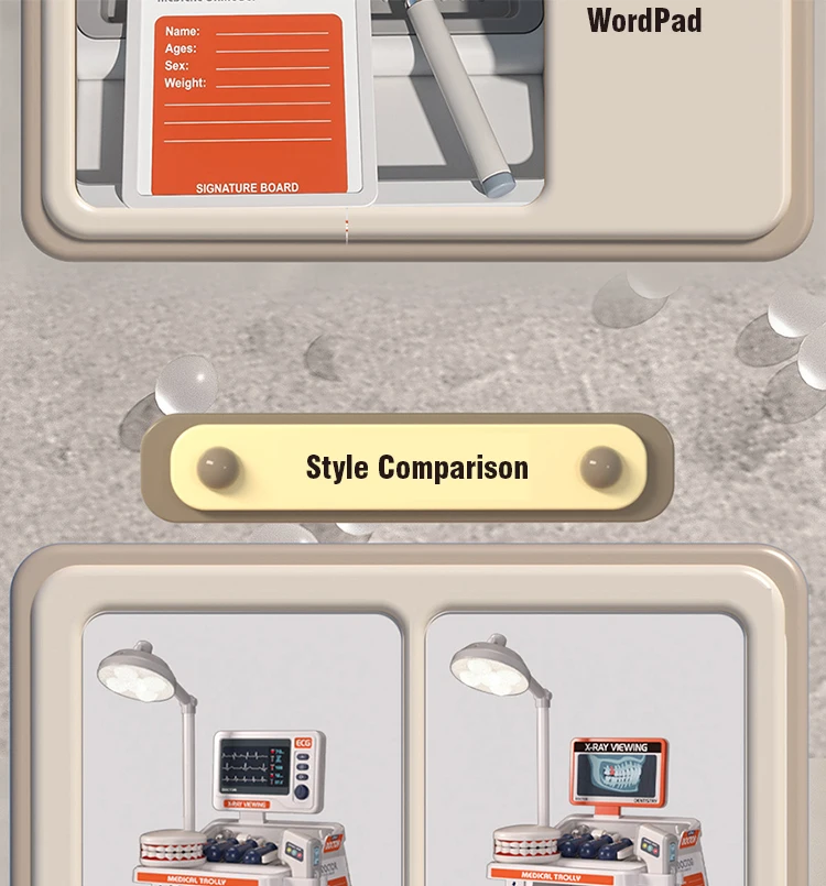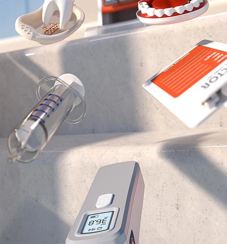 【26 piezas】 Taladro dental * 1, instrumento de limpieza dental * 1, cepillo de dientes * 1, alcance dental * 1, tijeras quirúrgicas * 1, tijeras de extracción de dientes * 1, cuchillo quirúrgico * 1, clips * 1, pinzas de extracción de dientes * 1, jeringa * 1, termómetro *1, dientes *1, pastillas *1, bandeja para tabletas *1, herramientas dentales *1, tarjeta de información *1, tarjeta de visión *1, estetoscopio *1, desinfectante para manos *1, medicinas *7,