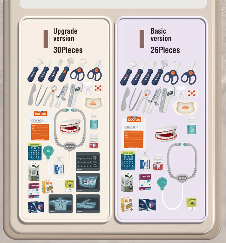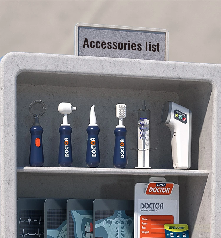 【30 piezas】 Taladro dental * 1, instrumento de limpieza dental * 1, cepillo de dientes * 1, alcance dental * 1, tijeras quirúrgicas * 1, tijeras de extracción de dientes * 1, cuchillo quirúrgico * 1, clips * 1, pinzas de extracción de dientes * 1, jeringa * 1, termómetro *1, dientes *1, pastillas *1, bandeja para tabletas *1, herramientas dentales *1, tarjeta de información *1, tarjeta de visión *1, estetoscopio *1, desinfectante para manos *1, medicinas *7, tarjetas *4