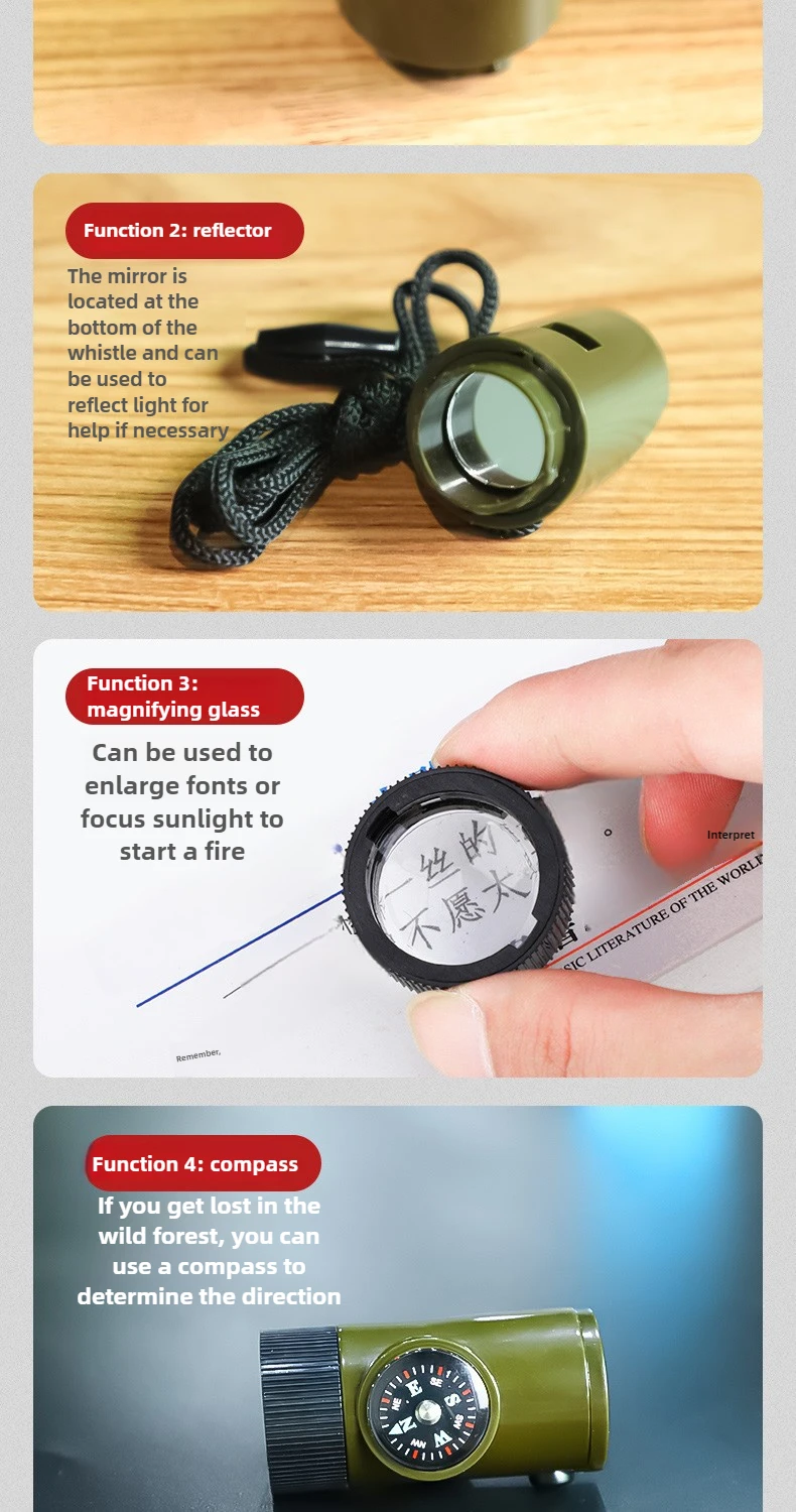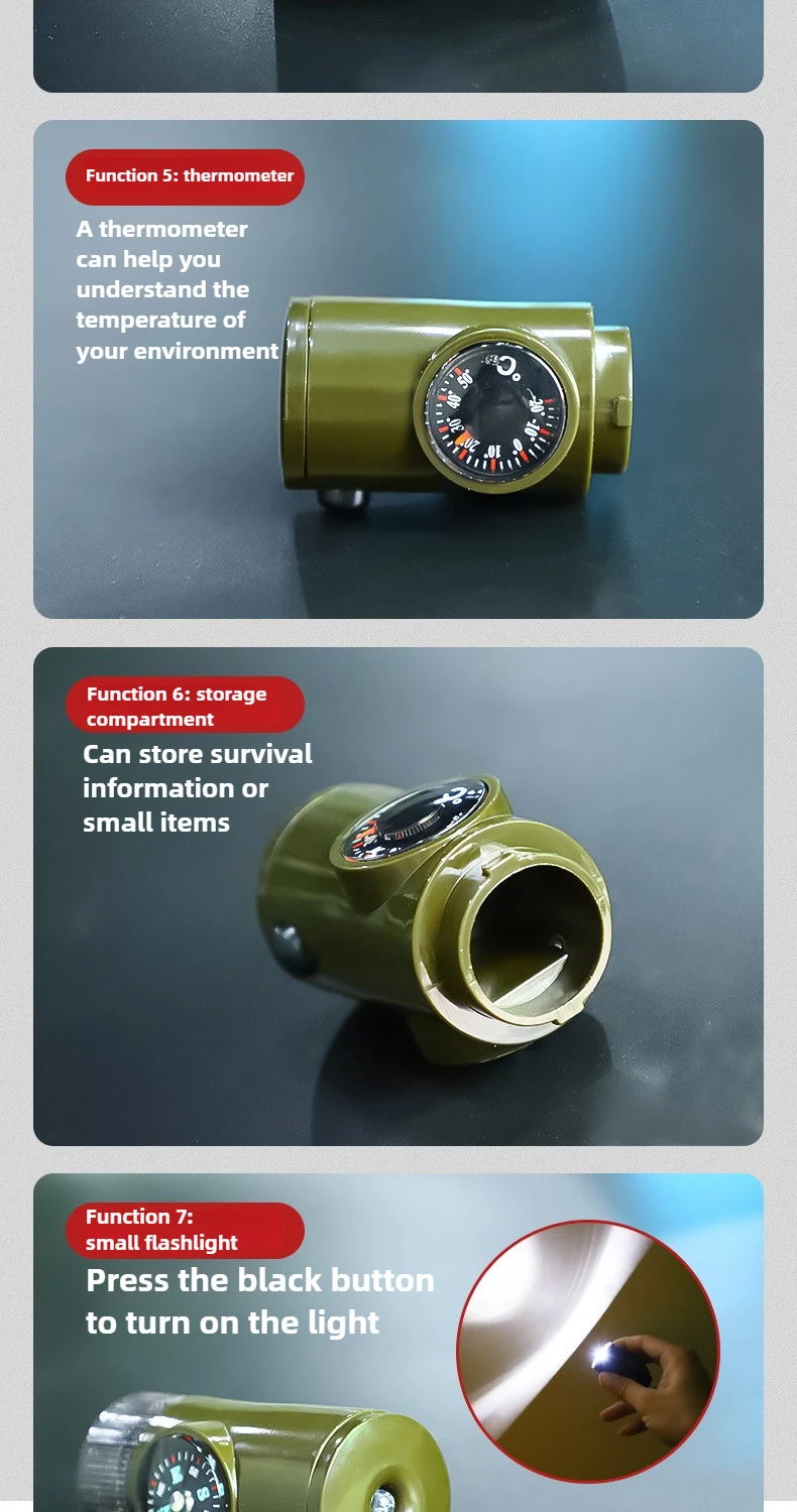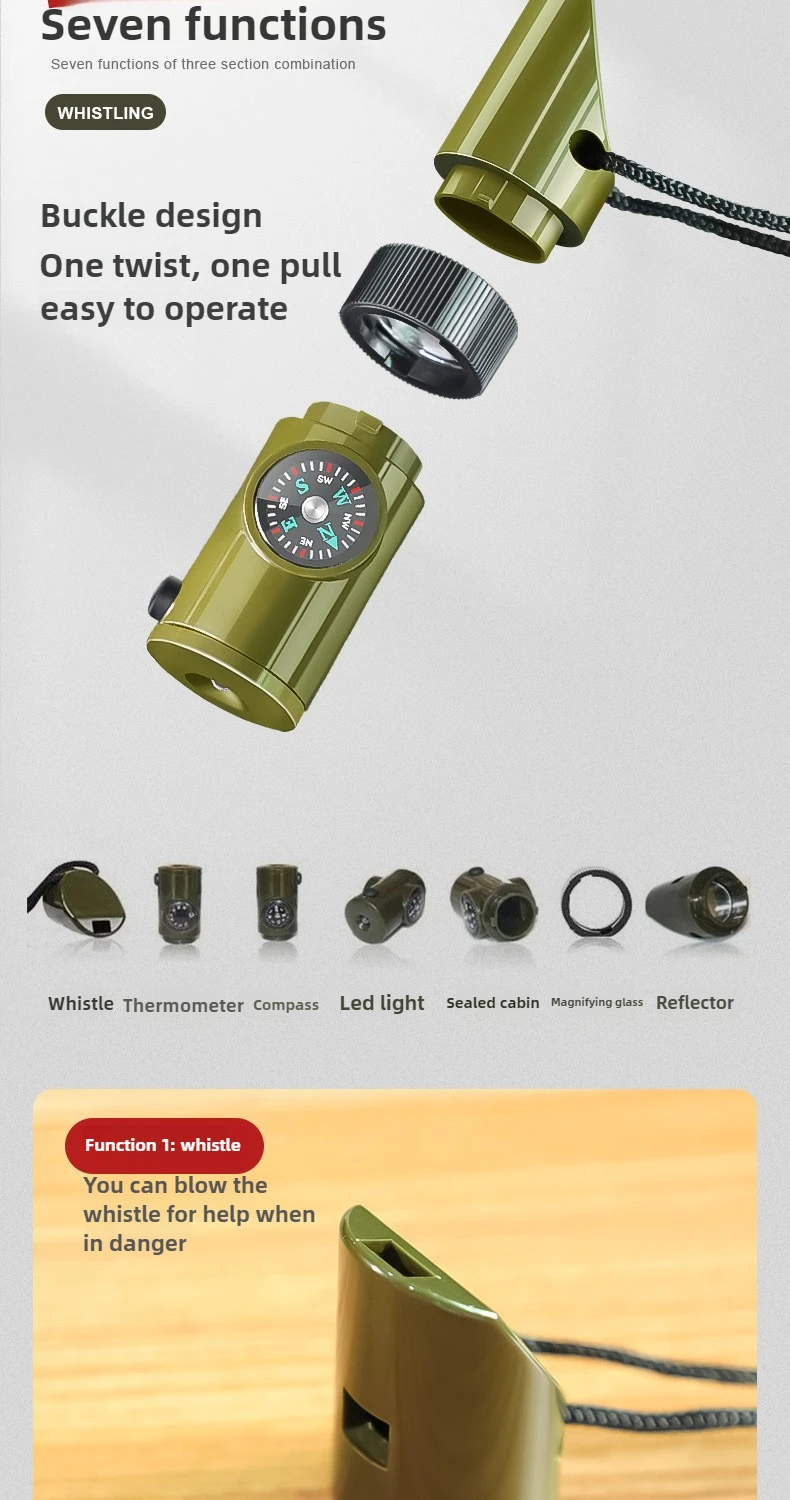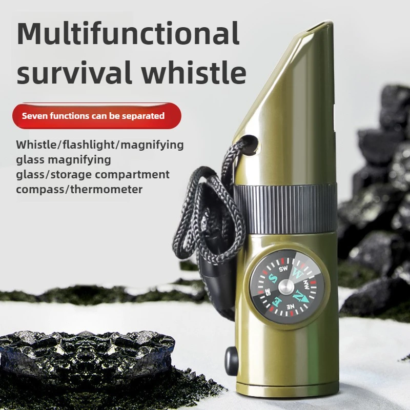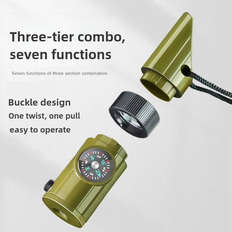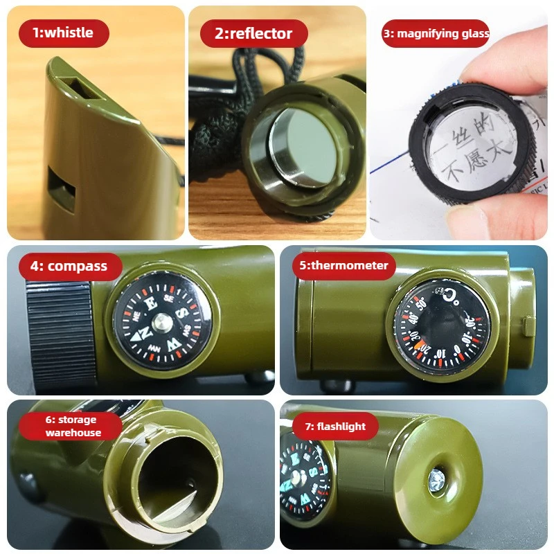 Equipo de supervivencia al aire libre, silbato 7 en 1, boújula de emergencia portátil multifuncional, lupa, linterna, termómetro
