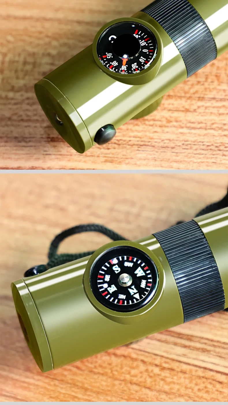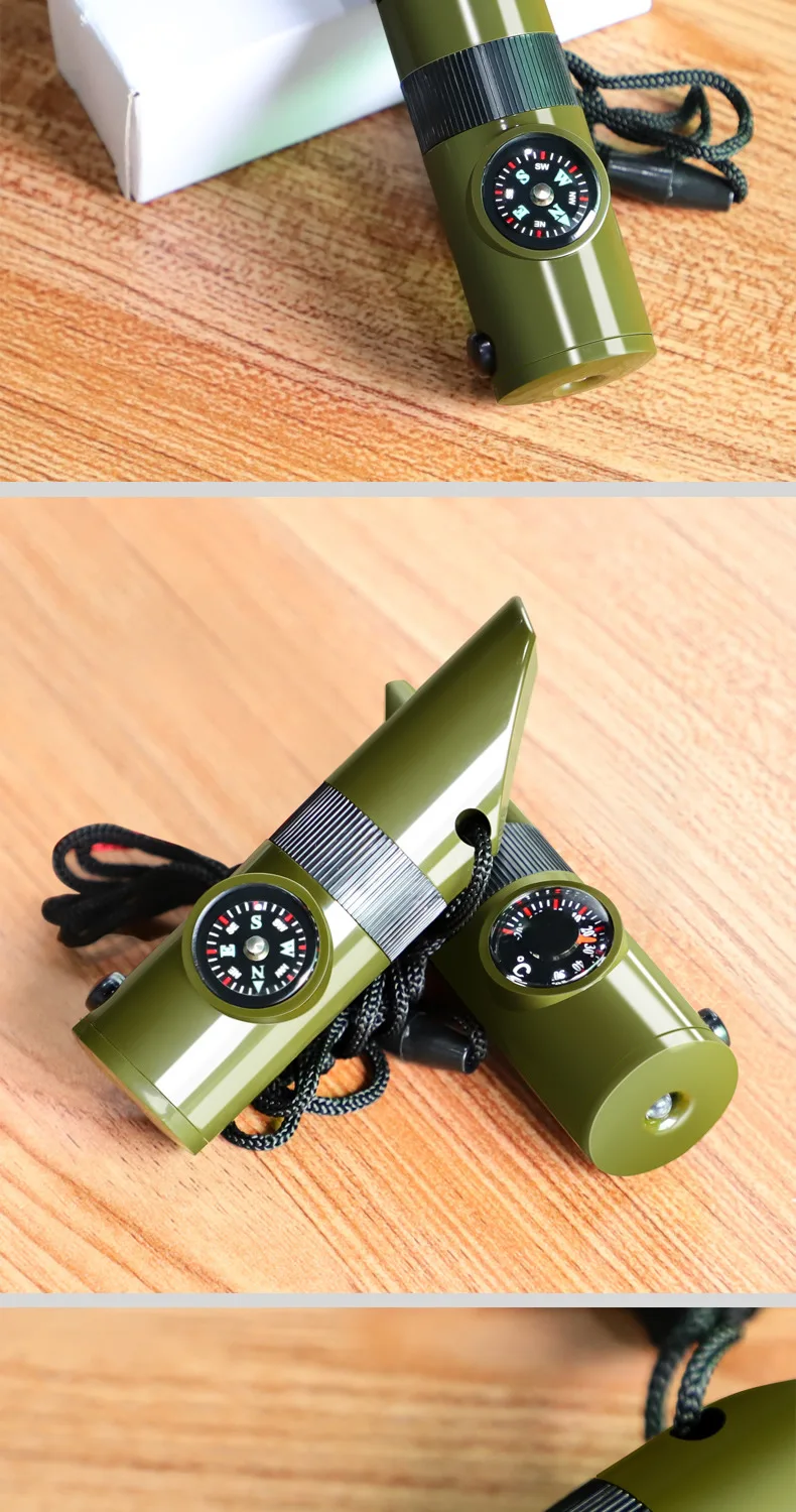 Comprar Equipo de supervivencia al aire libre, silbato 7 en 1, brújula de emergencia portátil multifuncional, lupa, linterna, termómetro