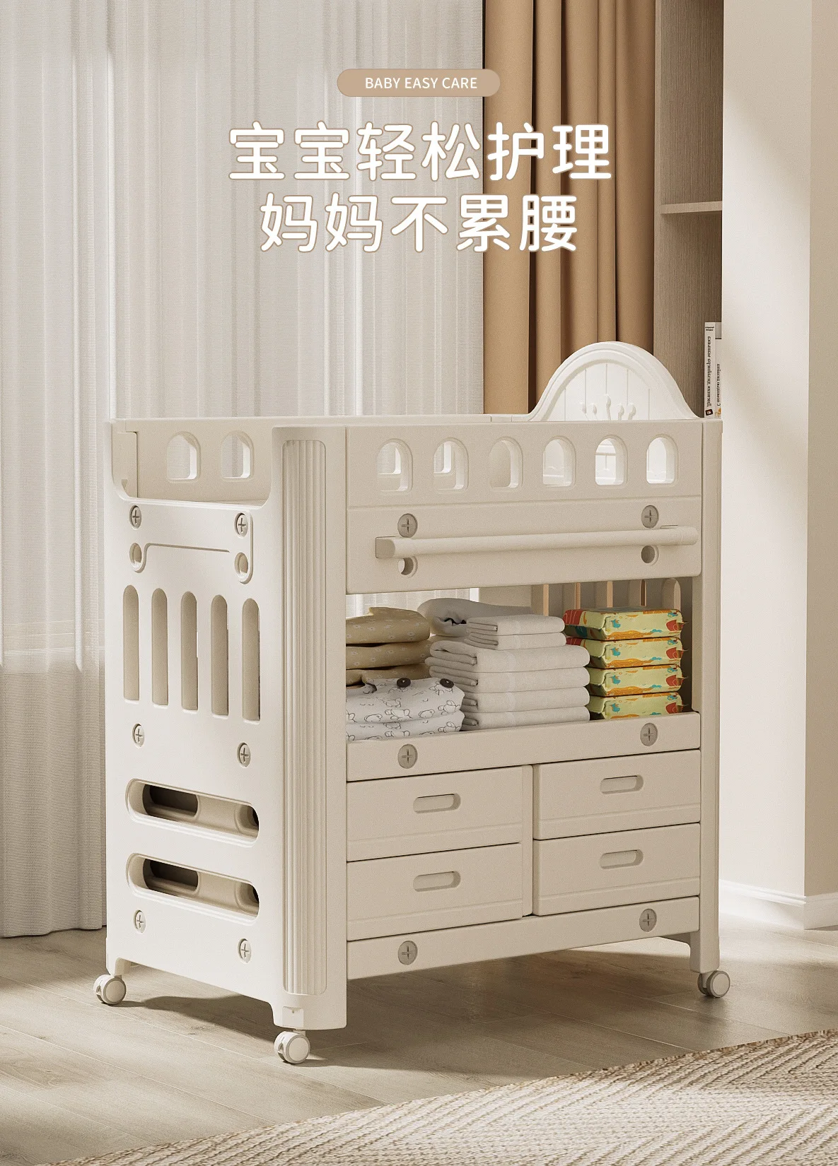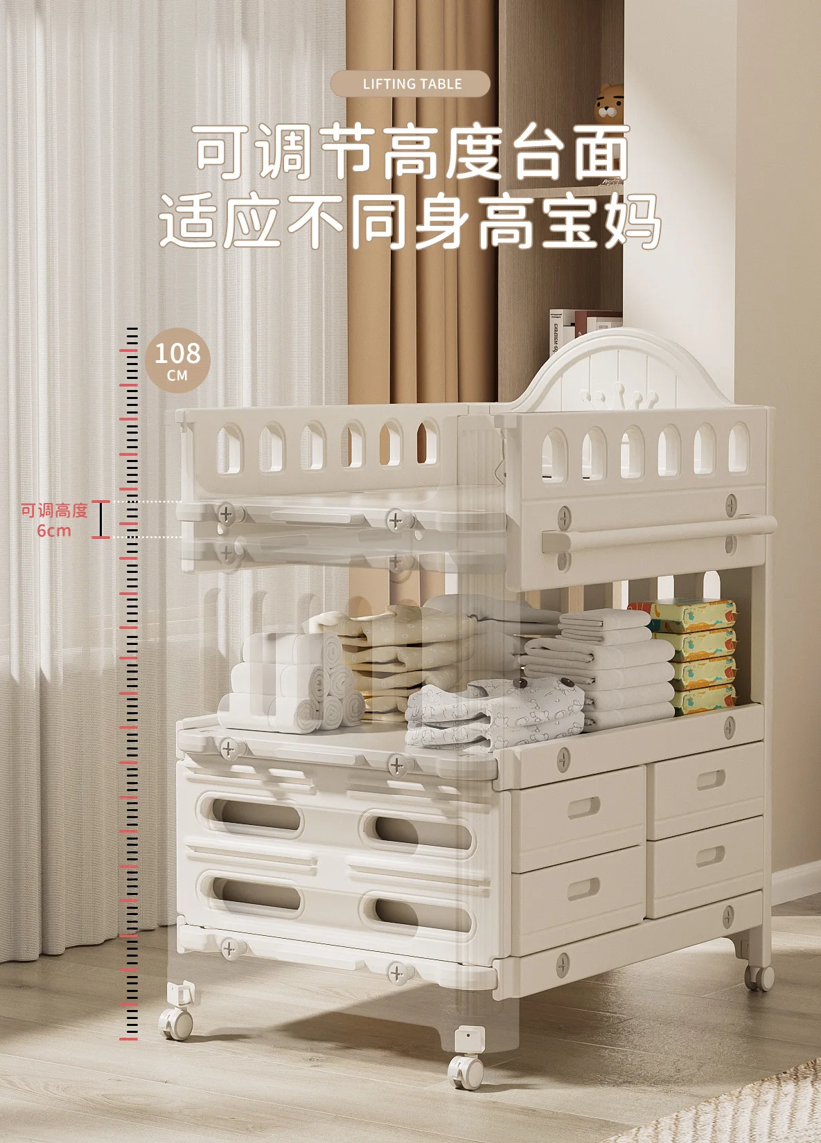 Estación móvil para el cuidado del bebé, almacenamiento de 3 niveles, mesa de lactancia plegable de altura ajustable con cinturones de seguridad, organizador multifuncional