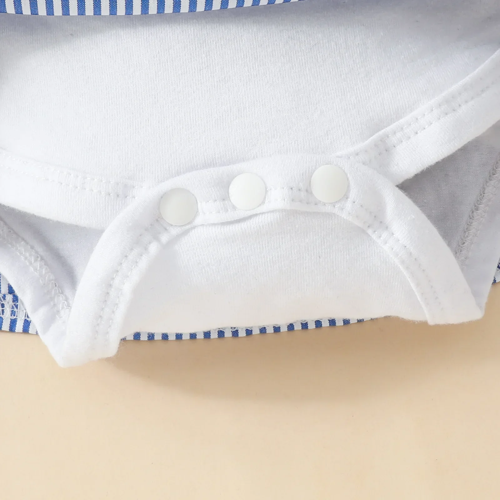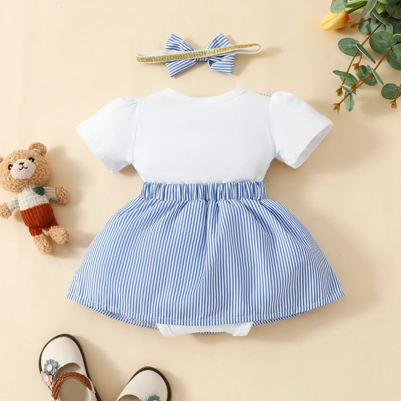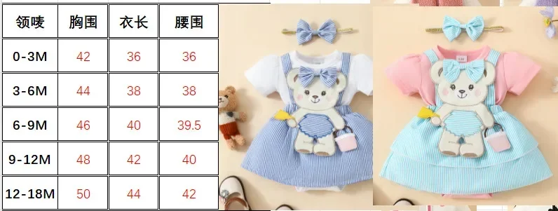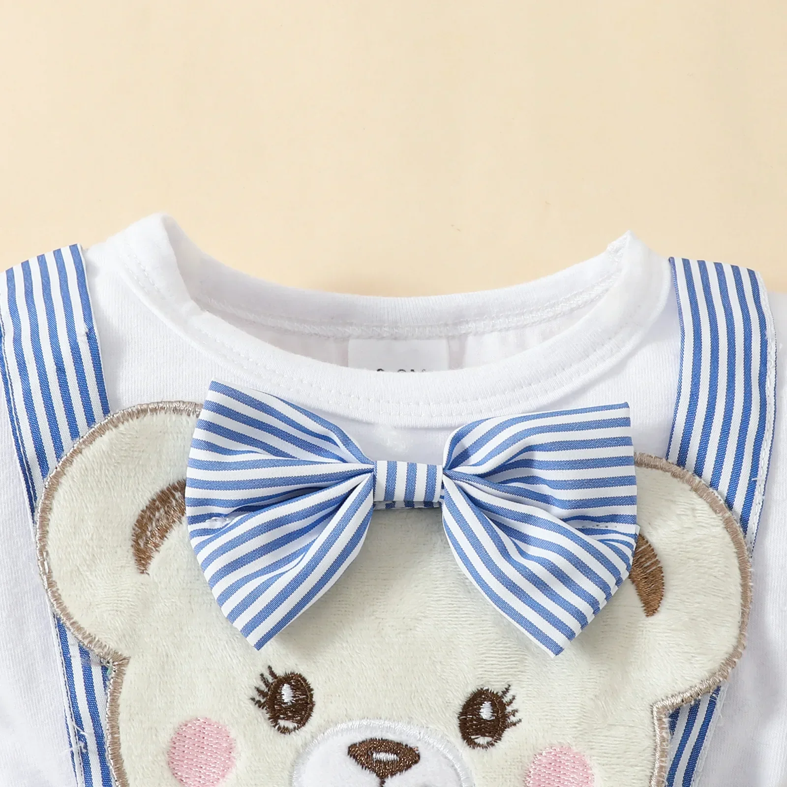 Estilo de algodón puro verano dulce niña arco impreso manga corta triángulo Ha Yi pana oso bebé falda con tirantes conjunto de 3 piezas
