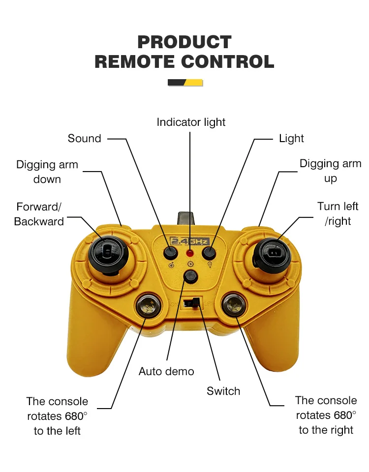 Adelante, atrás, gire a la derecha, izquierda, cavar, demostración con un solo clic, la consola gira 680 °, y con música y luz.