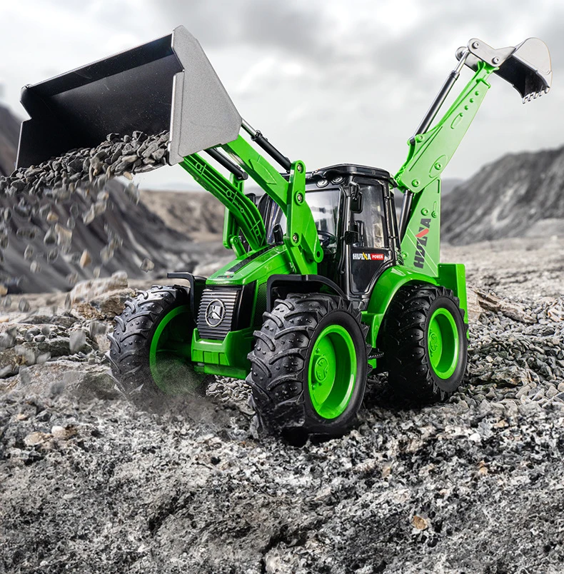 Comprar Excavadora retroexcavadora con Control remoto para niños, carretilla elevadora bidireccional, remolque de simulación de sonido y luz, vehículo de ingeniería de juguete, 1/14