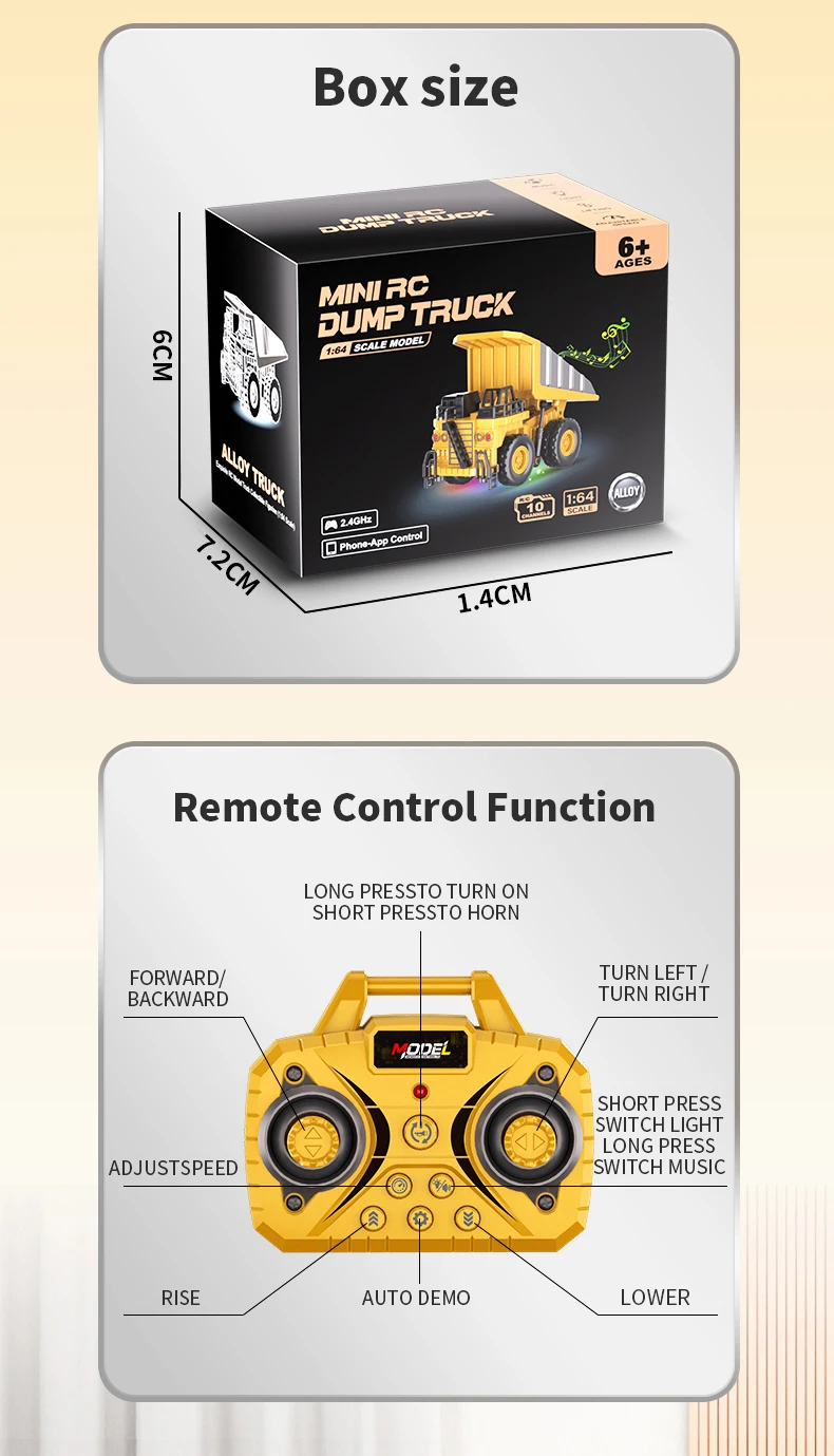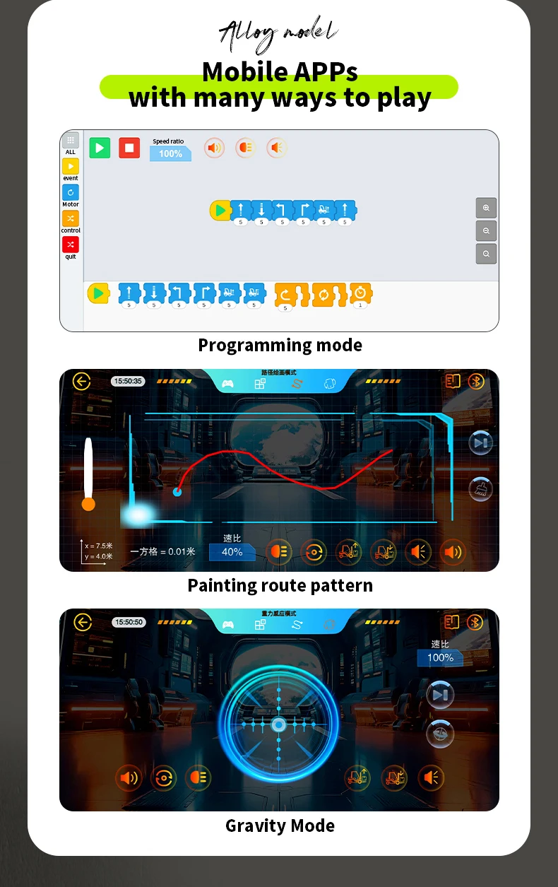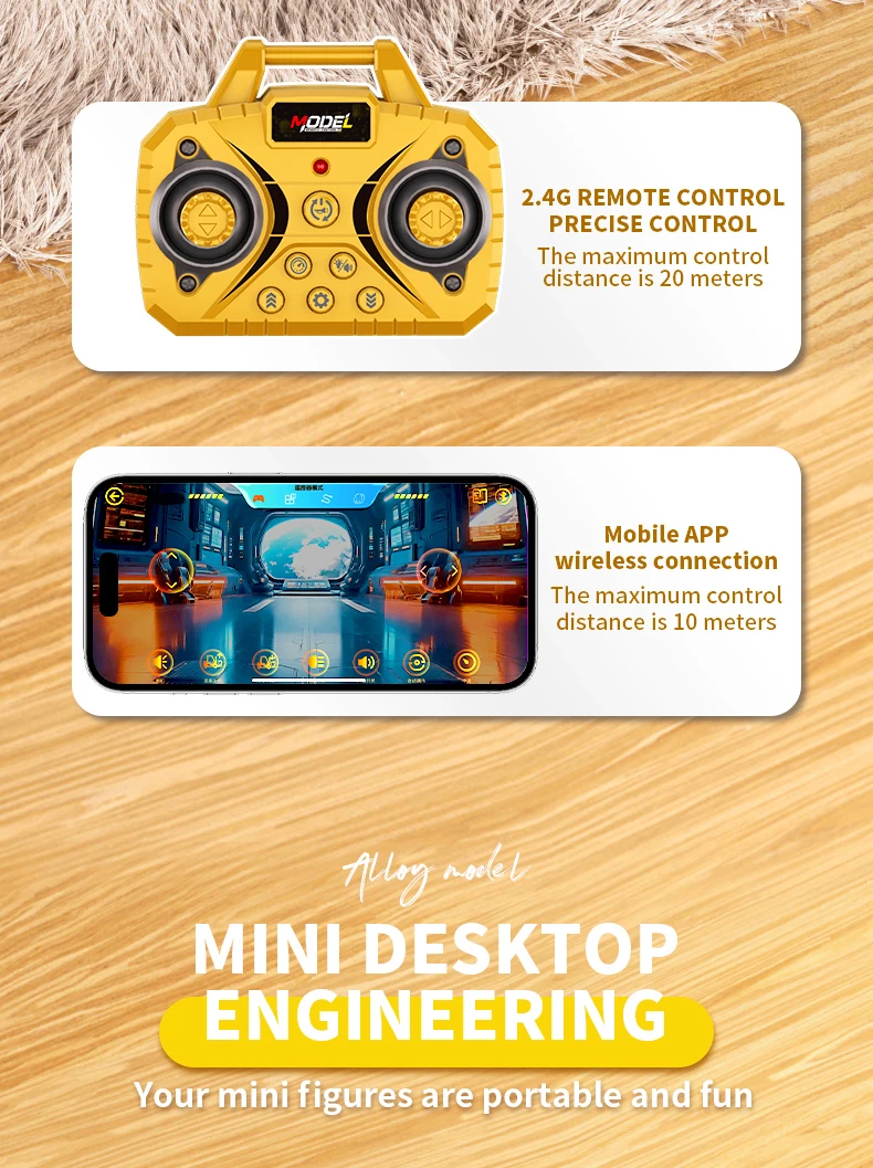 2.Mini modelo de simulación, con efectos de luz y sonido.3.Admite conexión de teléfono móvil APP para control remoto, con múltiples opciones de juego4.Adelante, atrás, giro a la izquierda, giro a la derecha, luz, música, bocina, arriba, abajo, ajuste de tres velocidades, demostración automática