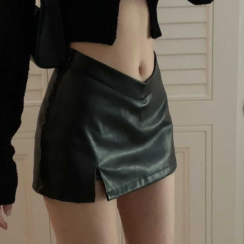 Comprar Falda de pantalones cortos de PU para mujer, falda Sexy Vintage de cintura alta, ajustada, dividida, de longitud media, ropa de calle