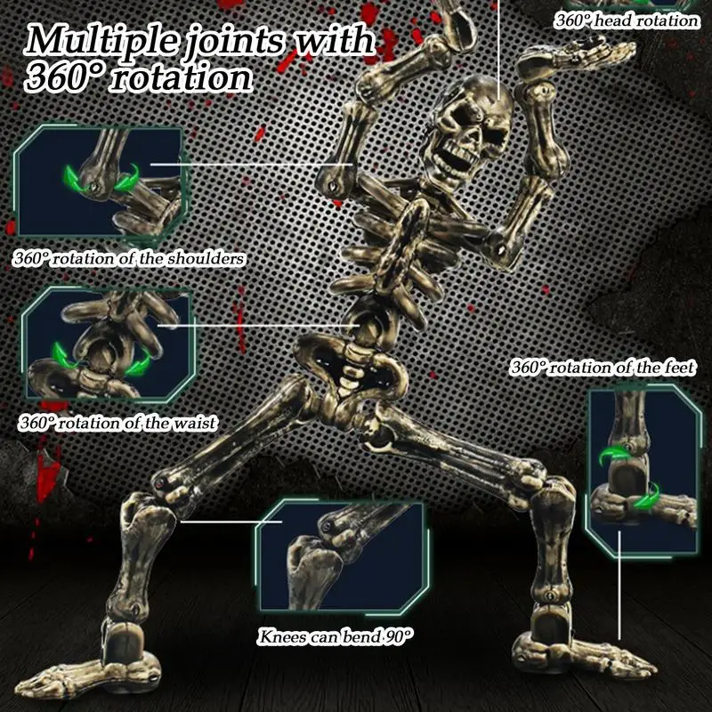 ¡Mejora la decoración navideña con nuestro juguete con figura de esqueleto!Este juguete único presenta una forma de esqueleto con múltiples articulaciones flexibles y resistentes.Crea una jugabilidad divertida en cualquier lugar, ya que se puede colocar fácilmente en varias posiciones.