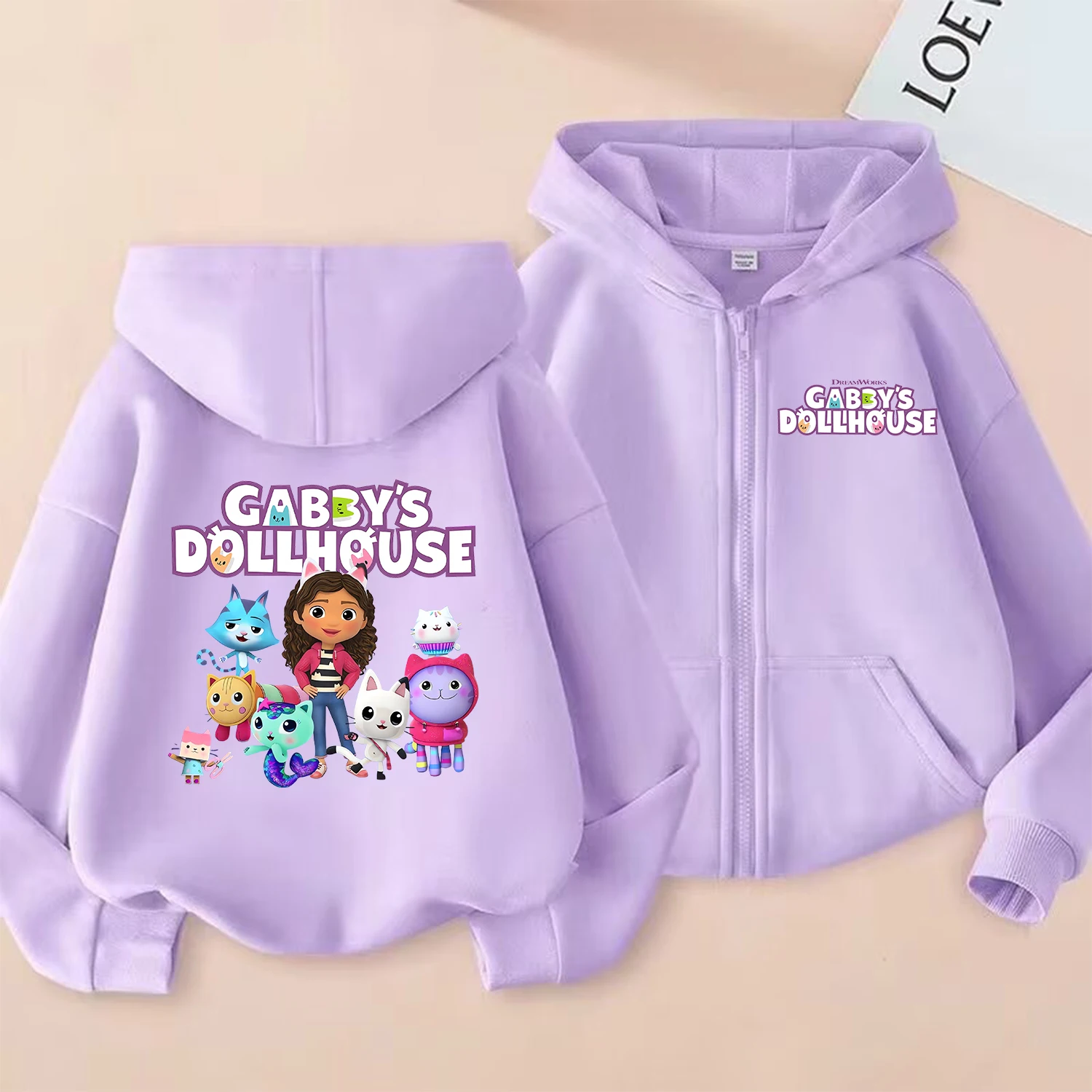 Gabby Dollhouse Sudadera con capucha y cremallera para niñas, abrigo de dibujos animados, ropa de Anime a la moda, chaqueta con capucha de otoño púrpura, sudadera Kawaii para niños, regalo