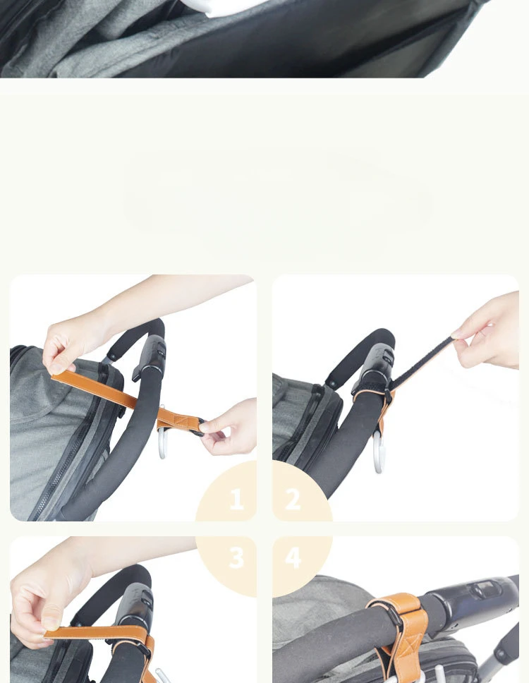 • Ganchos multifuncionales de cuero:Estos ganchos se pueden utilizar para colgar bolsas, cochecitos y otros accesorios, lo que los convierte en una adición versátil a su colección de cochecitos.