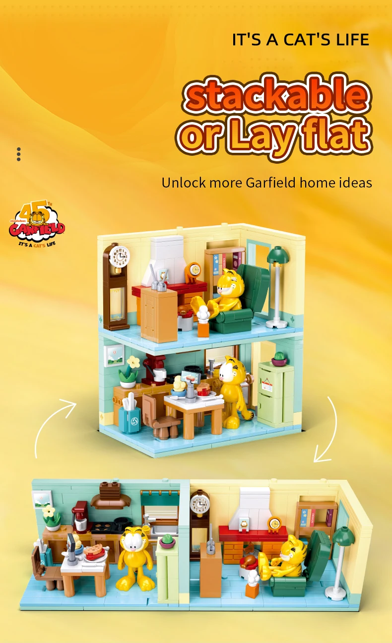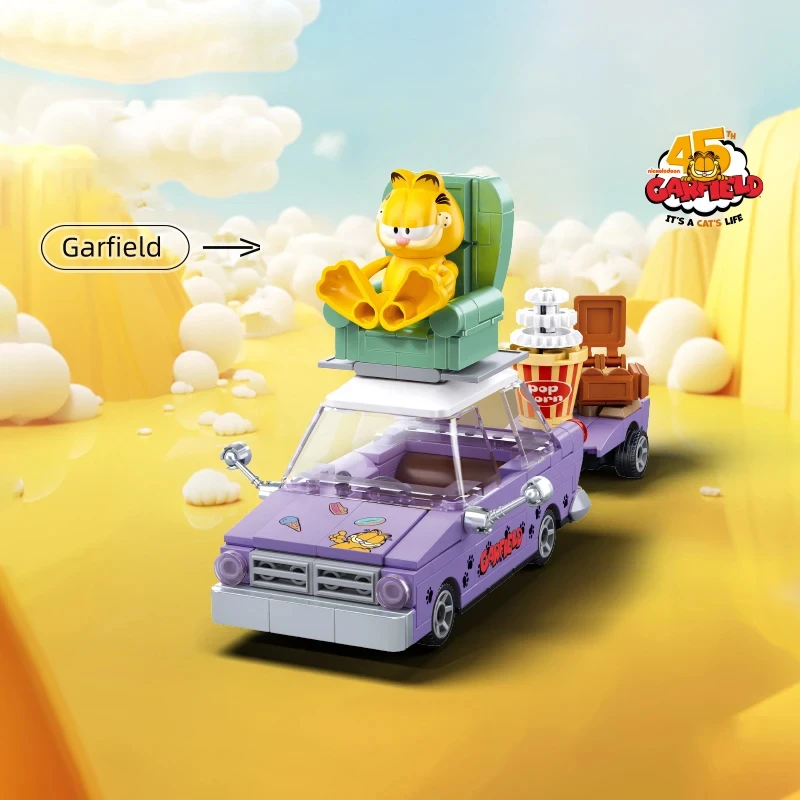 Comprar Garfield-bloques de construcción de automóviles para niños, colección de figuras de gato de dibujos animados mágicos de ciudad, modelo de exhibición, juguetes de ladrillos DIY, regalo de cumpleaños