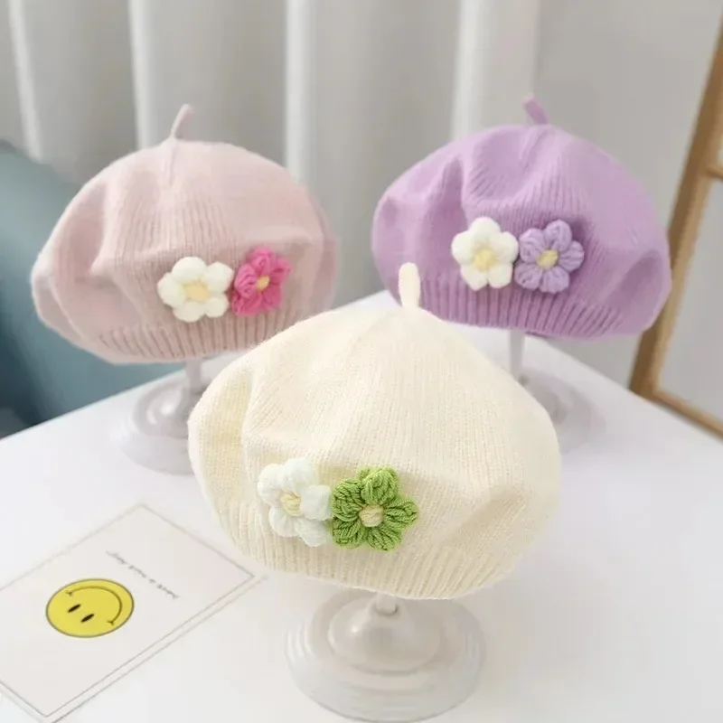 Gorro de boina de flores para bebé, gorro de punto cálido para niña, niña pequeña coreana, Princesa, artista, gorras de pintor de Color sólido, Invierno