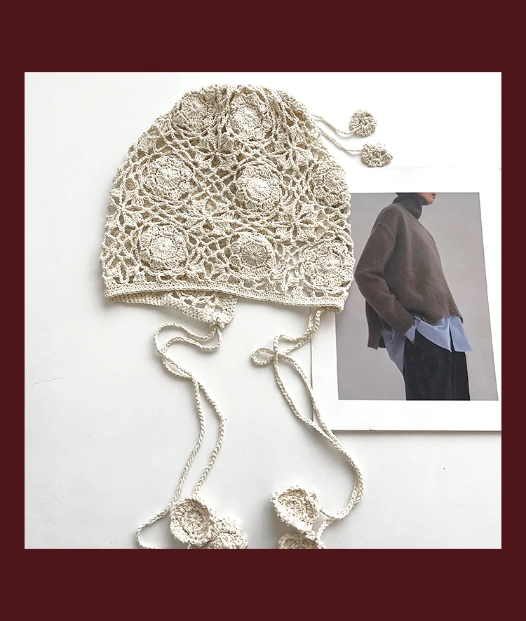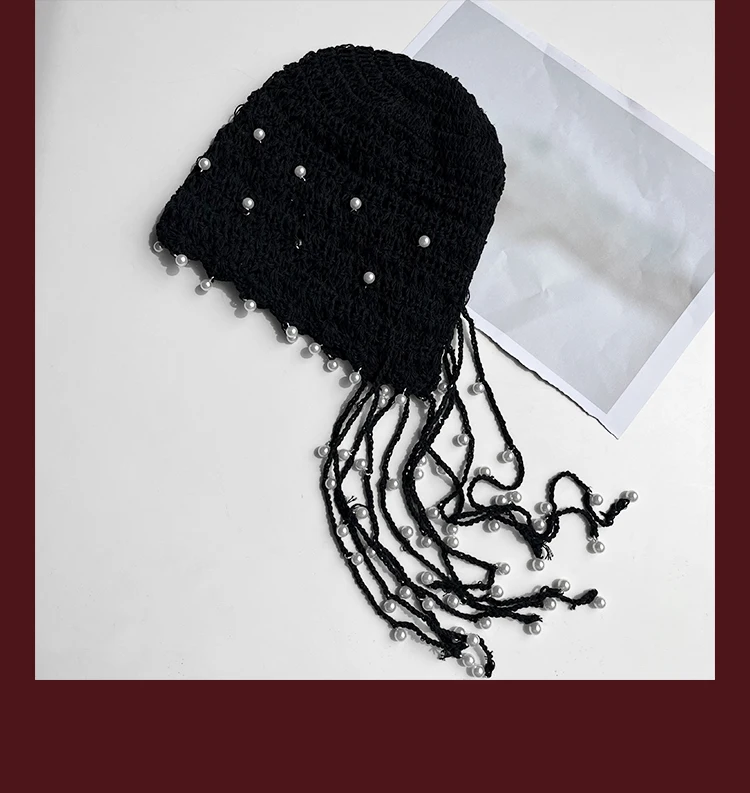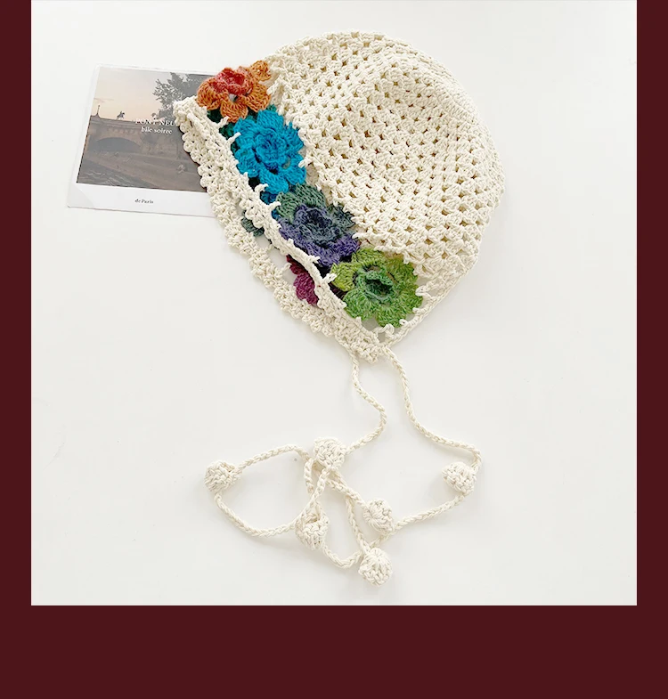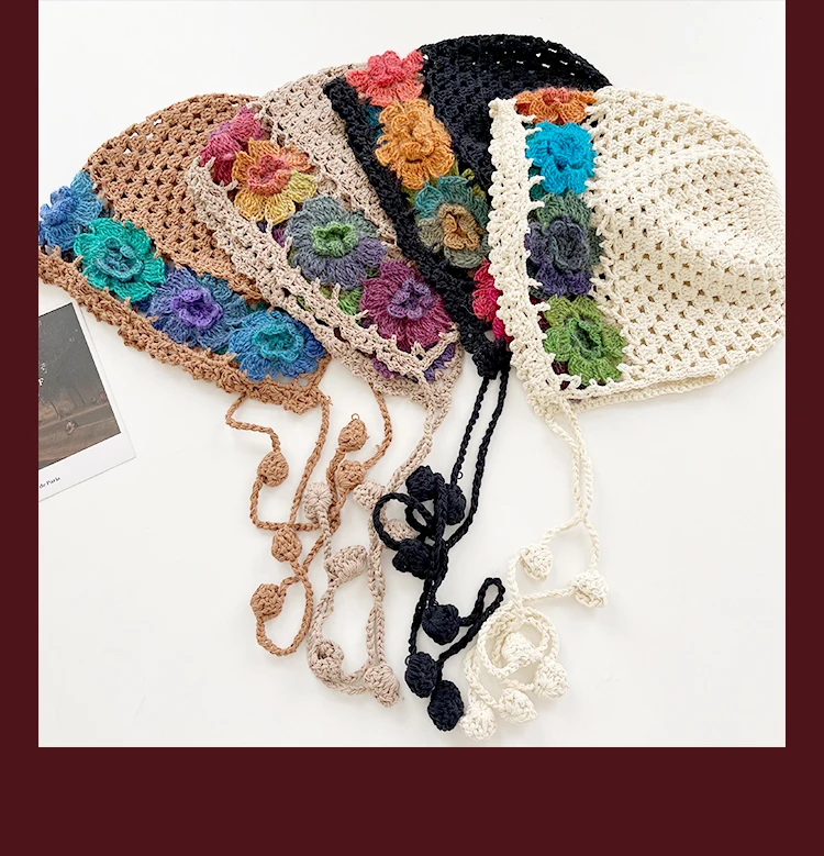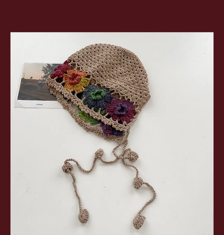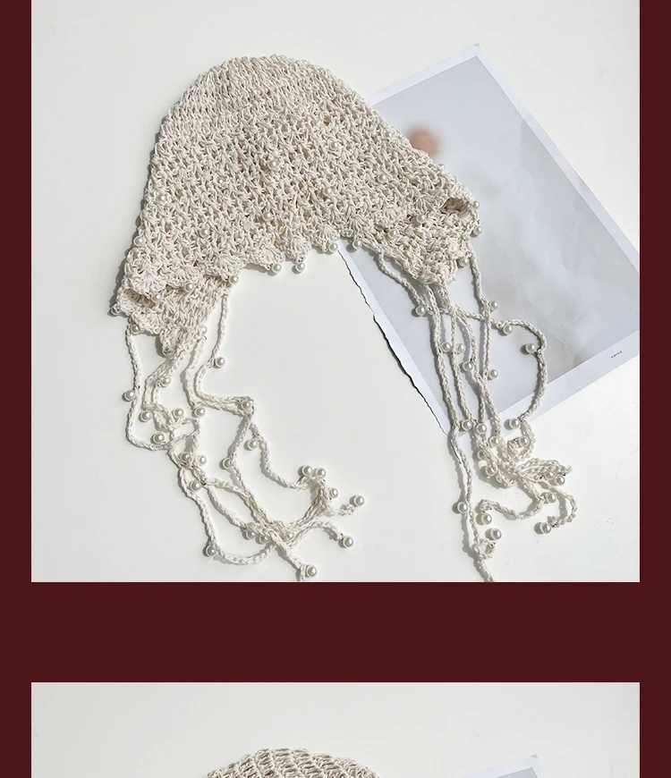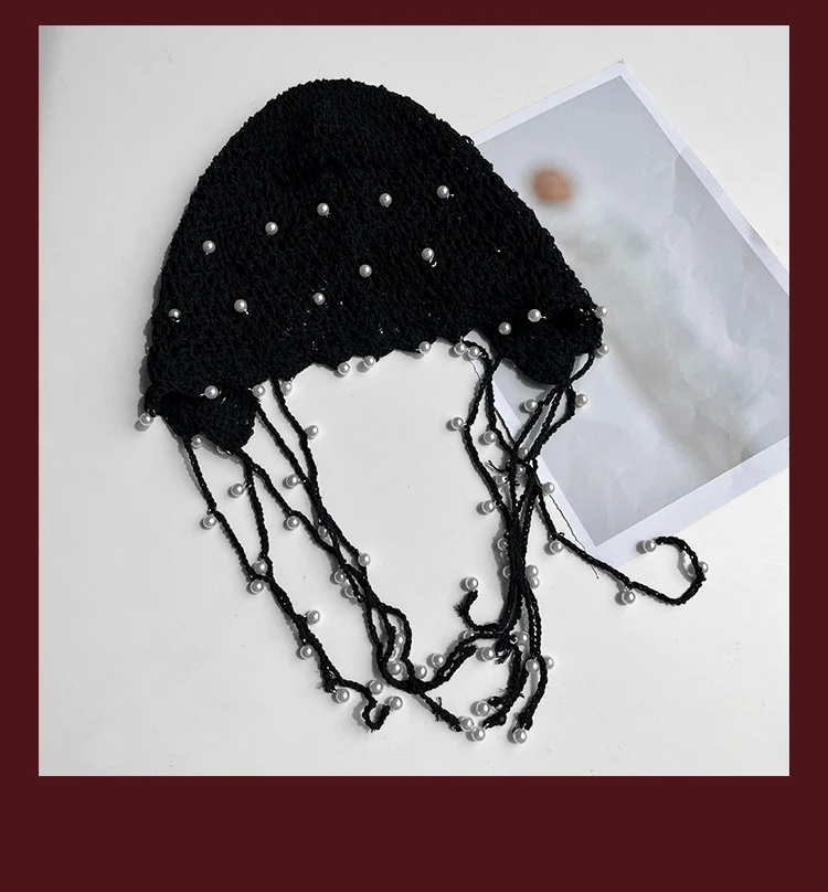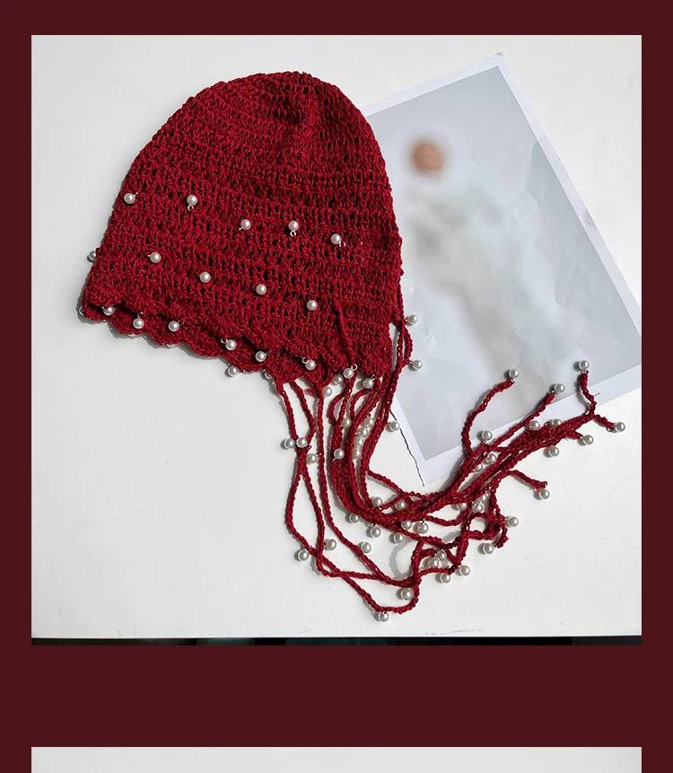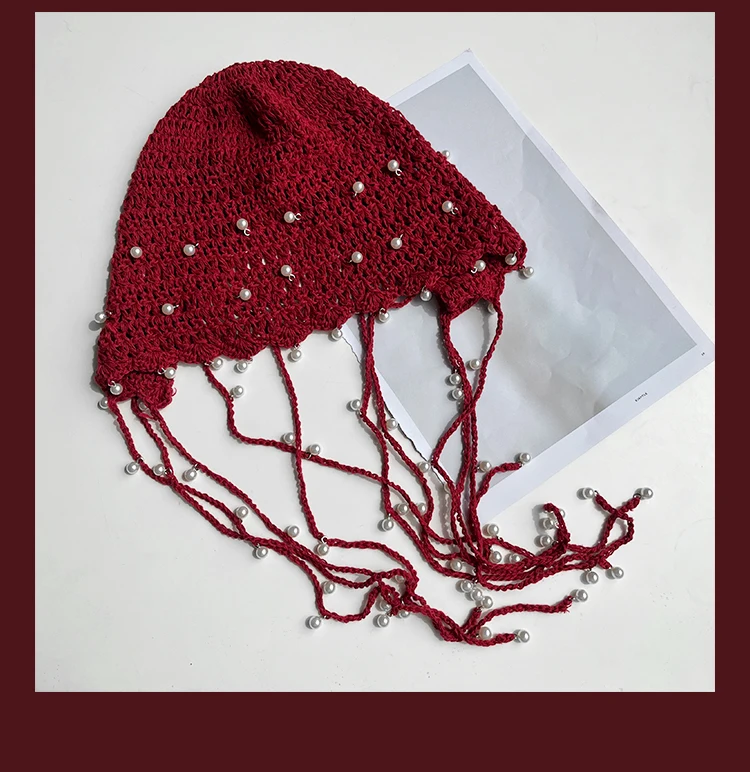 Gorro calado tejido hecho a mano para mujer, gorro de punto con gancho de flor de estilo coreano con borlas de perlas para primavera y verano