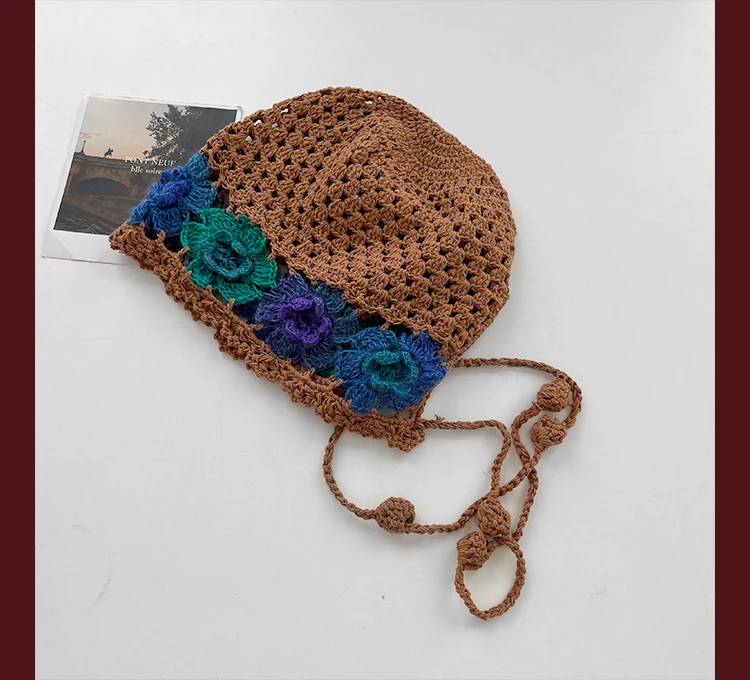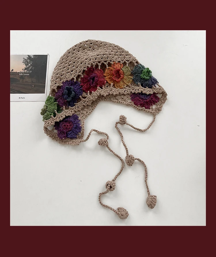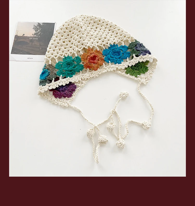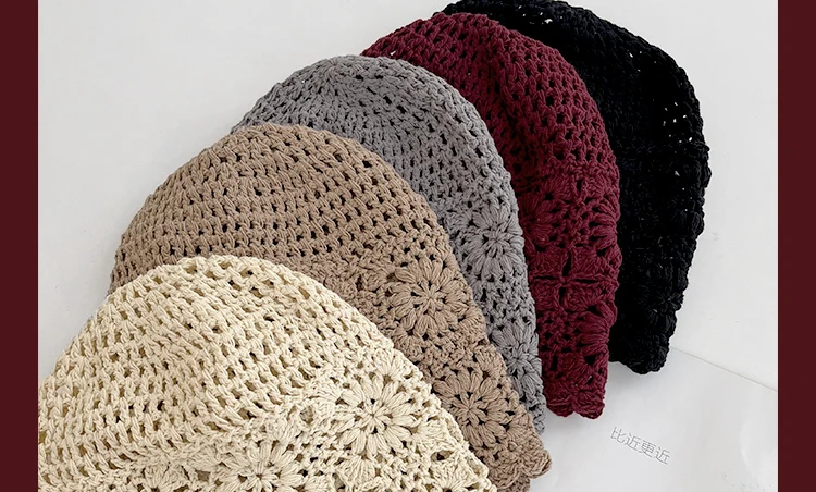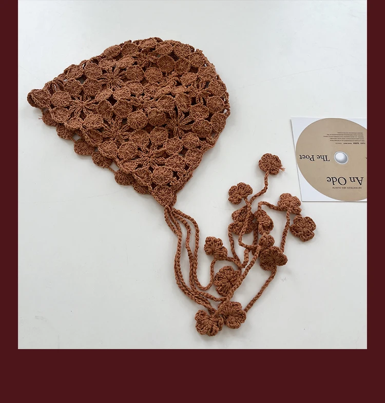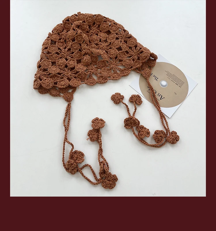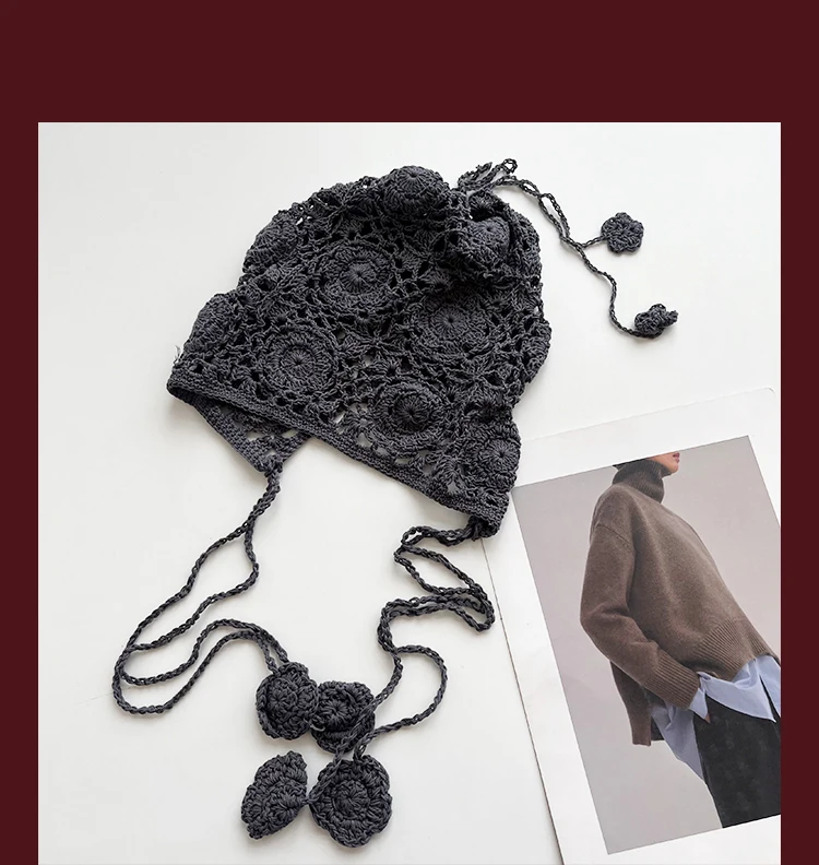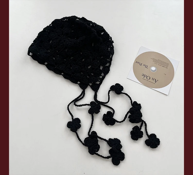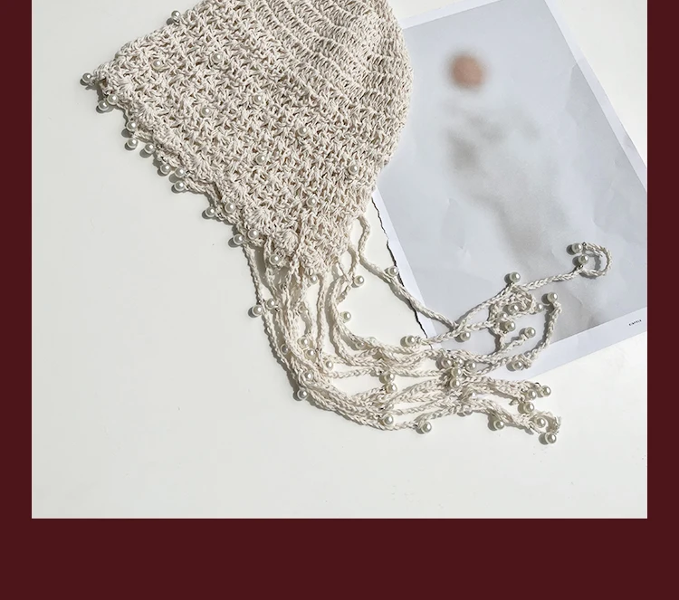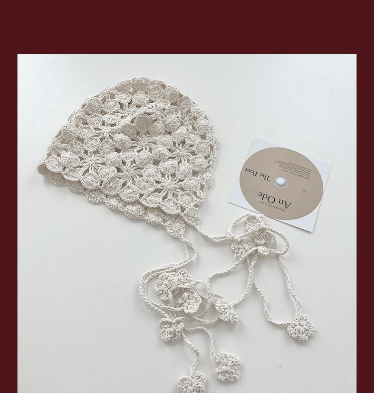 Gorro calado tejido hecho a mano para mujer, gorro de punto con gancho de flor de estilo coreano con borlas de perlas para primavera y verano
