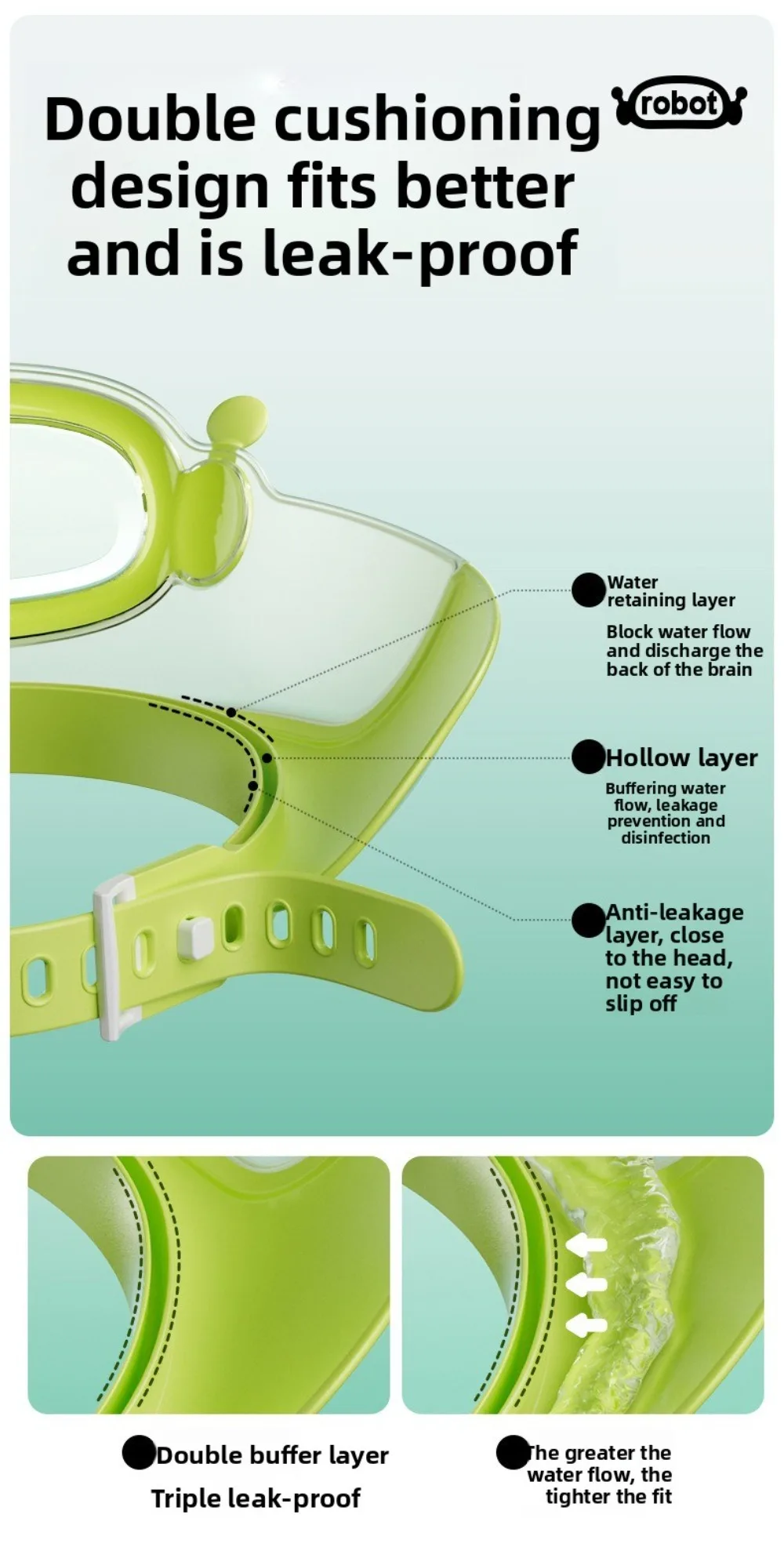 1.Comodidad personalizable: este gorro de champú ajustable para bebé ofrece un ajuste perfecto para su hijo, asegurando comodidad durante la hora del baño.El diseño de uso de cabeza de 2 direcciones proporciona flexibilidad y facilidad.