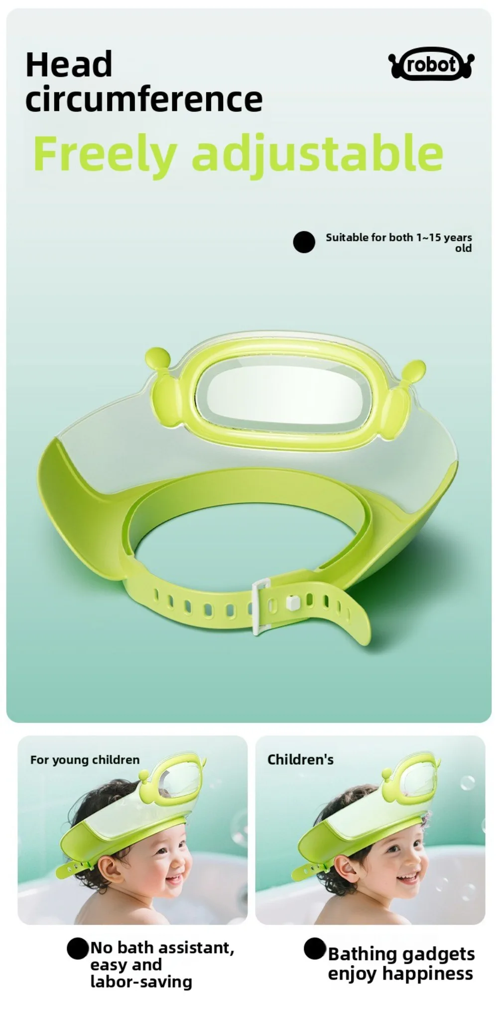4.Material impermeable: fabricada con materiales impermeables de alta calidad, esta gorra de champú ofrece una protección confiable, manteniendo la cara de su hijo seca y cómoda mientras se lava el cabello.