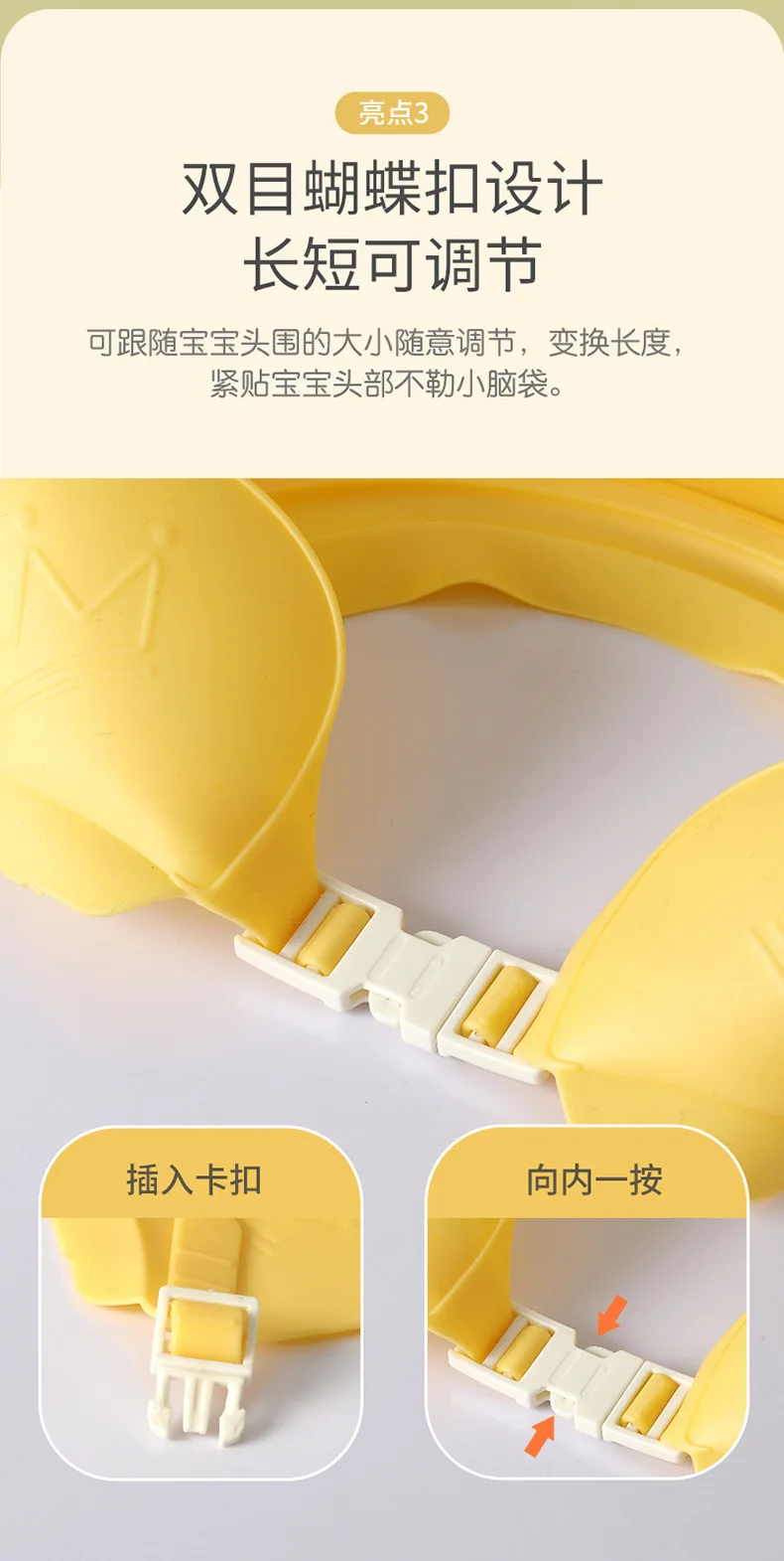 3. La circunferencia de la cabeza adopta un diseño de hebilla de mariposa, que se puede ajustar a voluntad de acuerdo con el tamaño de la circunferencia de la cabeza del bebé, y la longitud se puede cambiar para adaptarse a la cabeza del bebé.