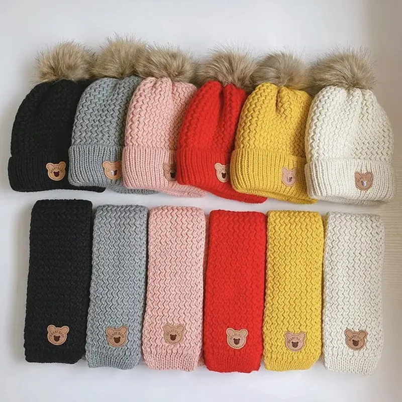 Gorro de punto con forro polar para bebé, Bola de Pompón, grueso, cálido, conjunto de gorro y bufanda para niño y niña, pañuelo para el cuello, Otoño e Invierno
