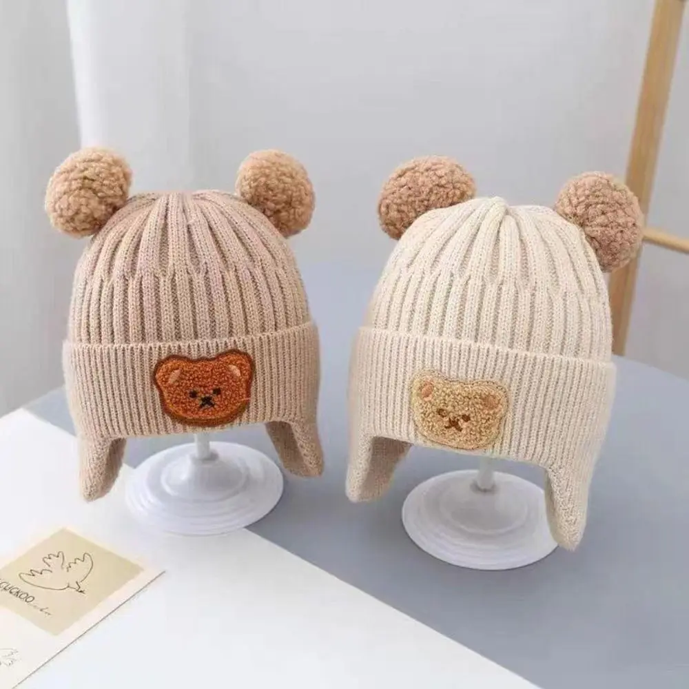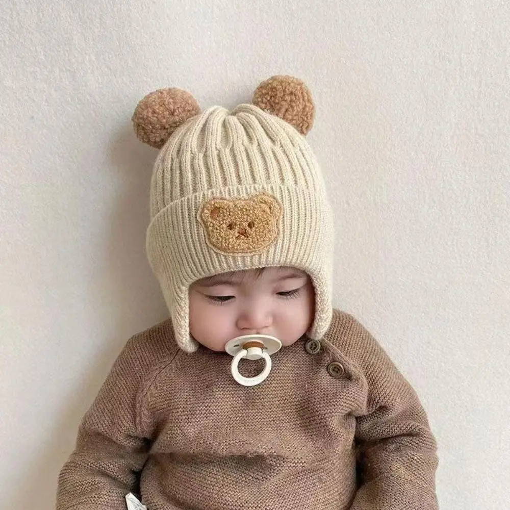 Comprar Gorro tejido con protección para los oídos de oso de dibujos animados, gorro de invierno para bebé, gorro para niños pequeños y niñas, bonitos gorros coreanos cálidos de ganchillo para niños