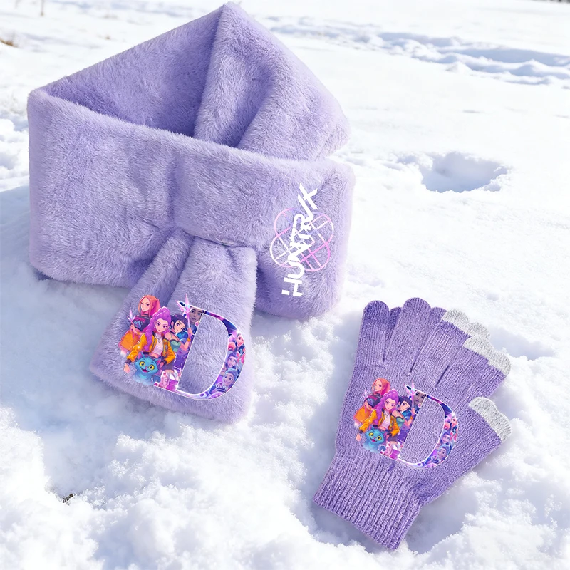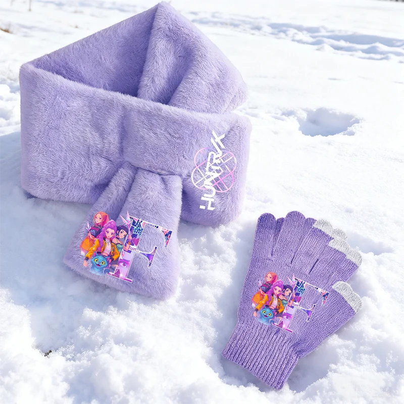 Guantes de 19CM, bufanda de 90CM para adultos K Pop Demon Hunters, niñas, letras de dibujos animados, pañuelo de invierno, pantalla, guantes, regalos de cumpleaños para niños