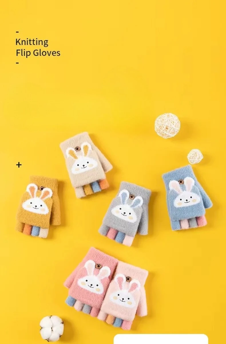 Guantes de cinco dedos con bonito conejo de dibujos animados para niños, manoplas de medio dedo gruesas y cálidas para invierno, manoplas tejidas para niños, guantes cálidos con tapa
