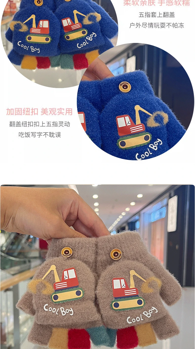 Comprar Guantes de invierno de dibujos animados para niño, excavadora bonita, gruesos y cálidos, manoplas con tapa de medio dedo para niños, guantes para niños a prueba de viento para exteriores