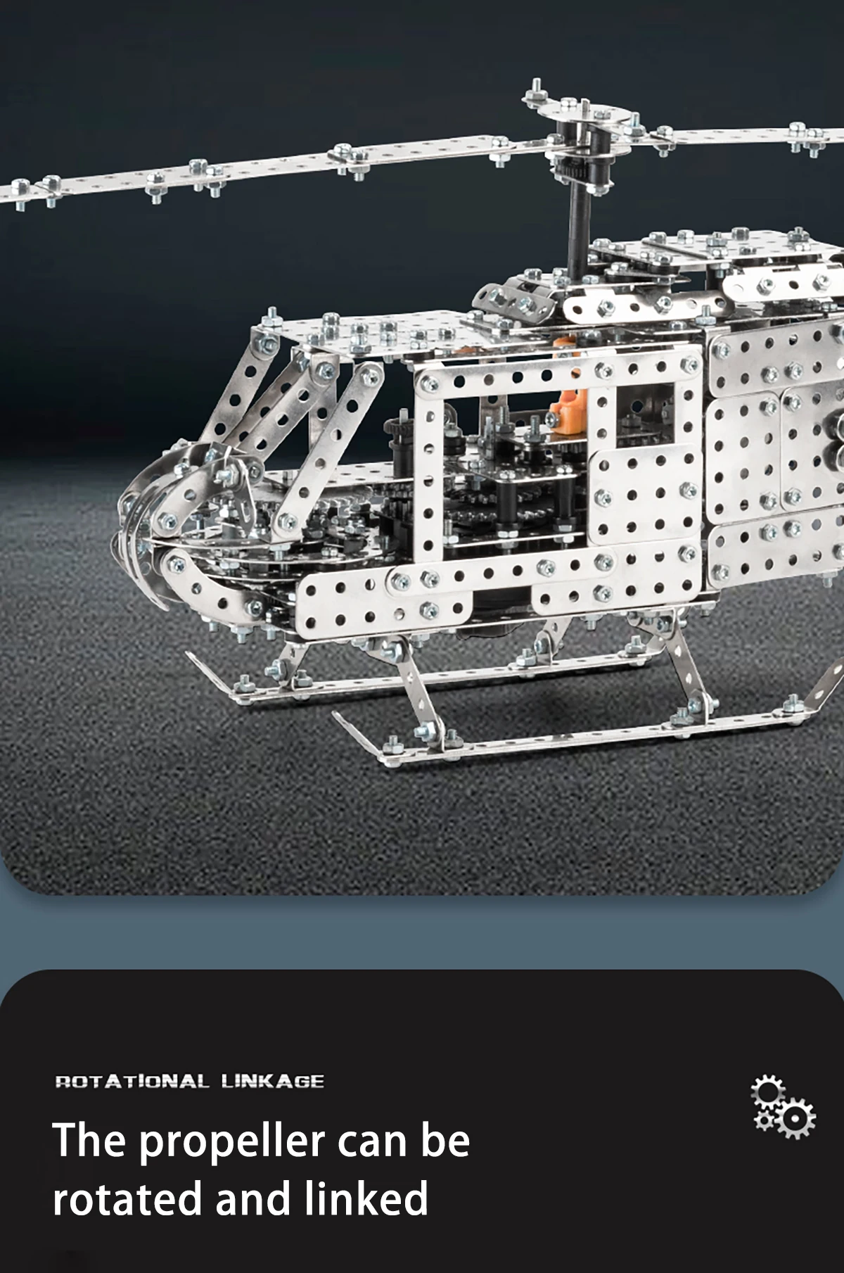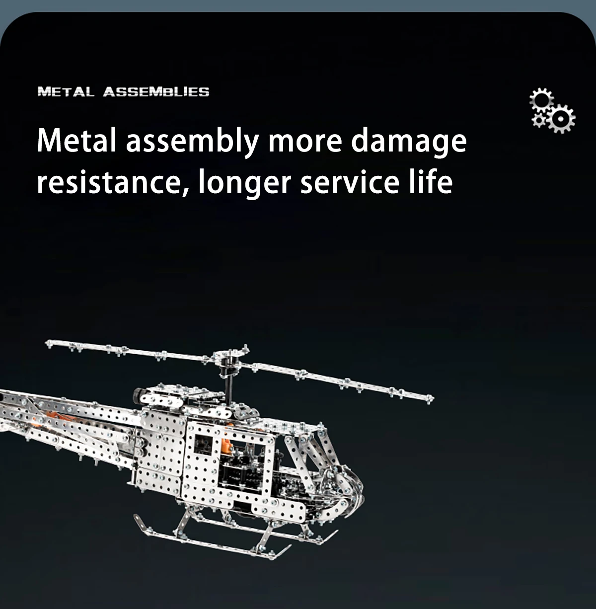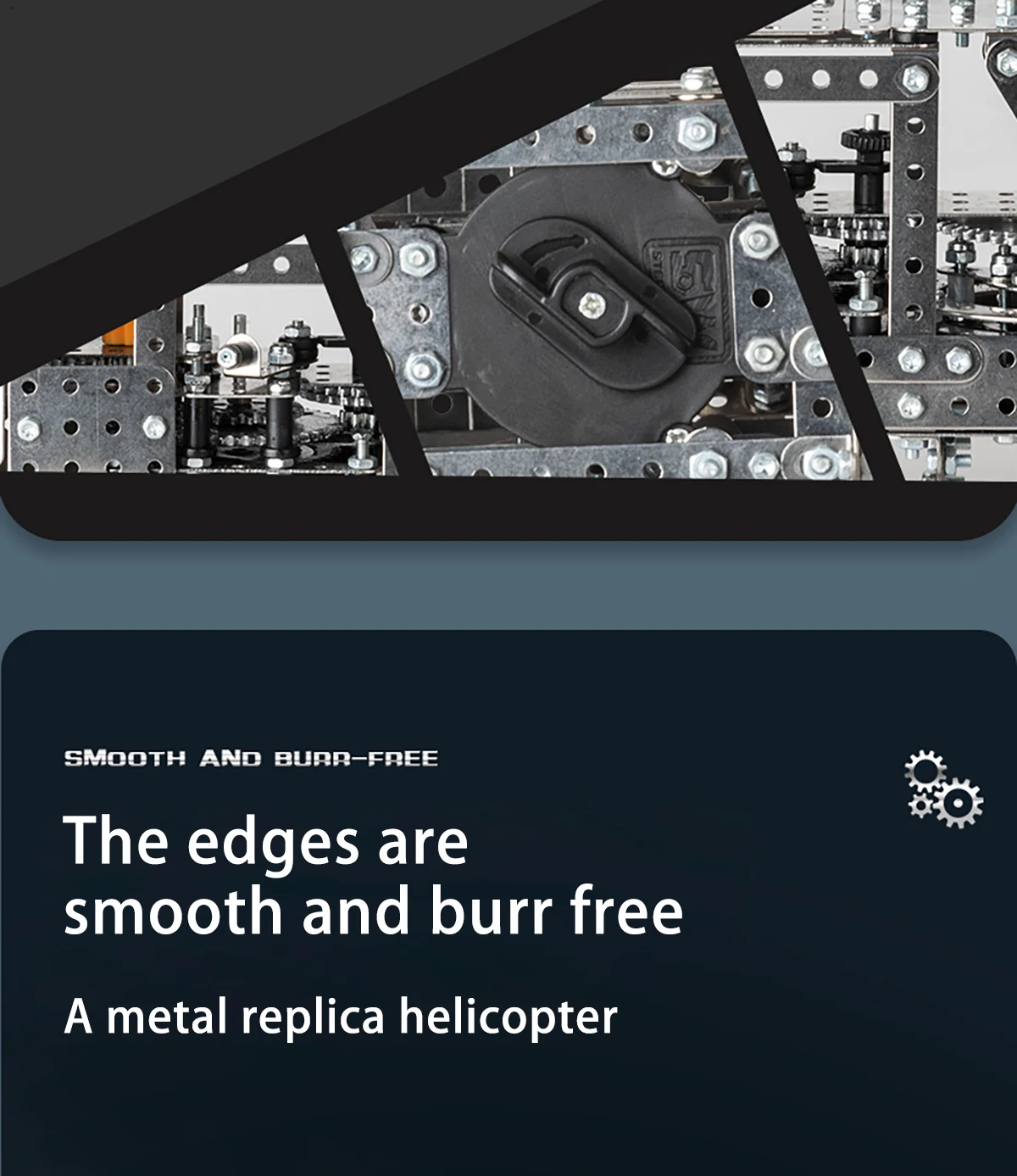 ¡Qué juguete tan bueno! Los elementos planos están bien pulidos, prácticamente no tienen rebabas ni bordes afilados. En las piezas en forma de L o dobladas, sin embargo, el desbarbado no está presente, por lo que se debe tener más cuidado al manipularlas. Los pernos son Torx, lo cual es muy conveniente porque funcionan mucho mejor que las llaves Allen en este tamaño compacto. La llave se mantuvo funcional en todo momento. El diseño es en su mayoría el mismo, pero hay muchos detalles que difieren en el producto en comparación con las imágenes de la tienda. El ensamblaje del rotor es muy diferente; la conexión del brazo trasero está fijada de manera distinta, la cola tiene elementos distintos, y el marco interior de la ventana de la cabina no está conectado al techo, a diferencia de lo que muestran las imágenes. Los engranajes son de aluminio y no están bien asegurados en los ejes. Creo que se podrían haber utilizado algunas piezas de plástico para solucionarlo, pero una vez que se completa la construcción, simplemente no es posible desmontar el sistema para implementar esos cambios. Esto significa que el accionamiento funciona de manera intermitente, sin poder girar realmente el rotor. Siempre se pega y se adhiere en algún lugar.