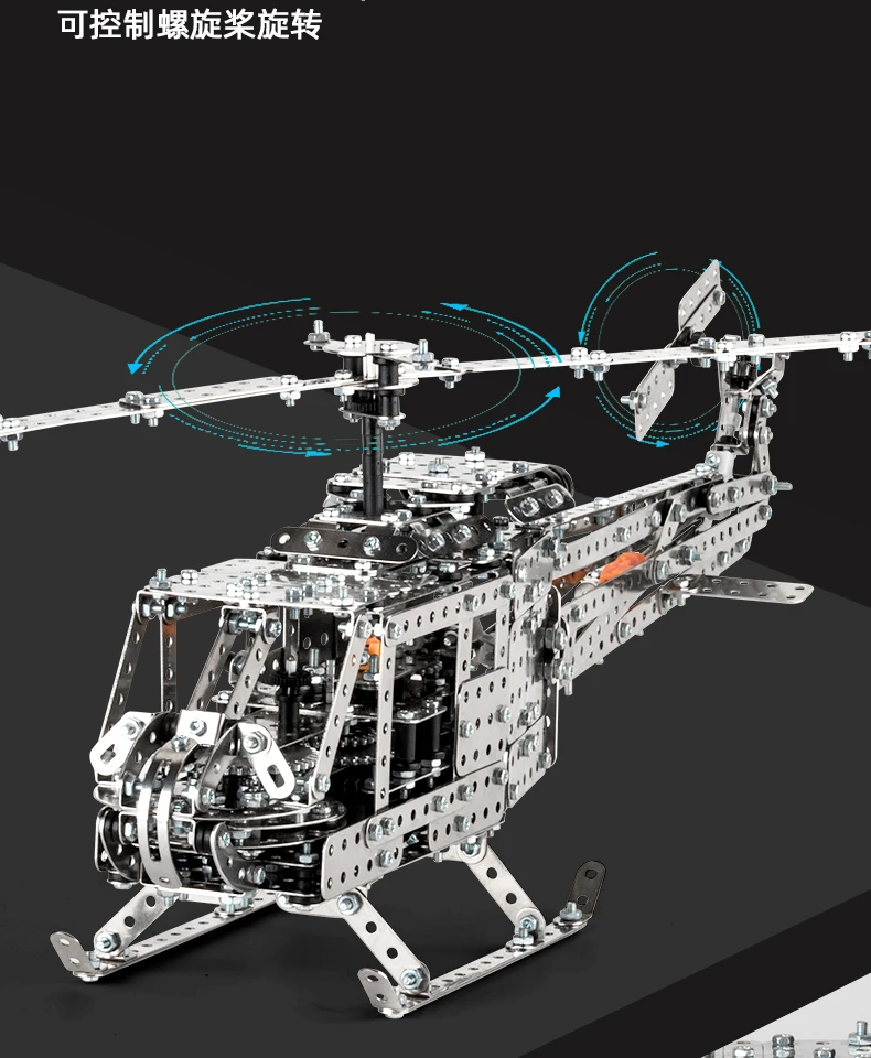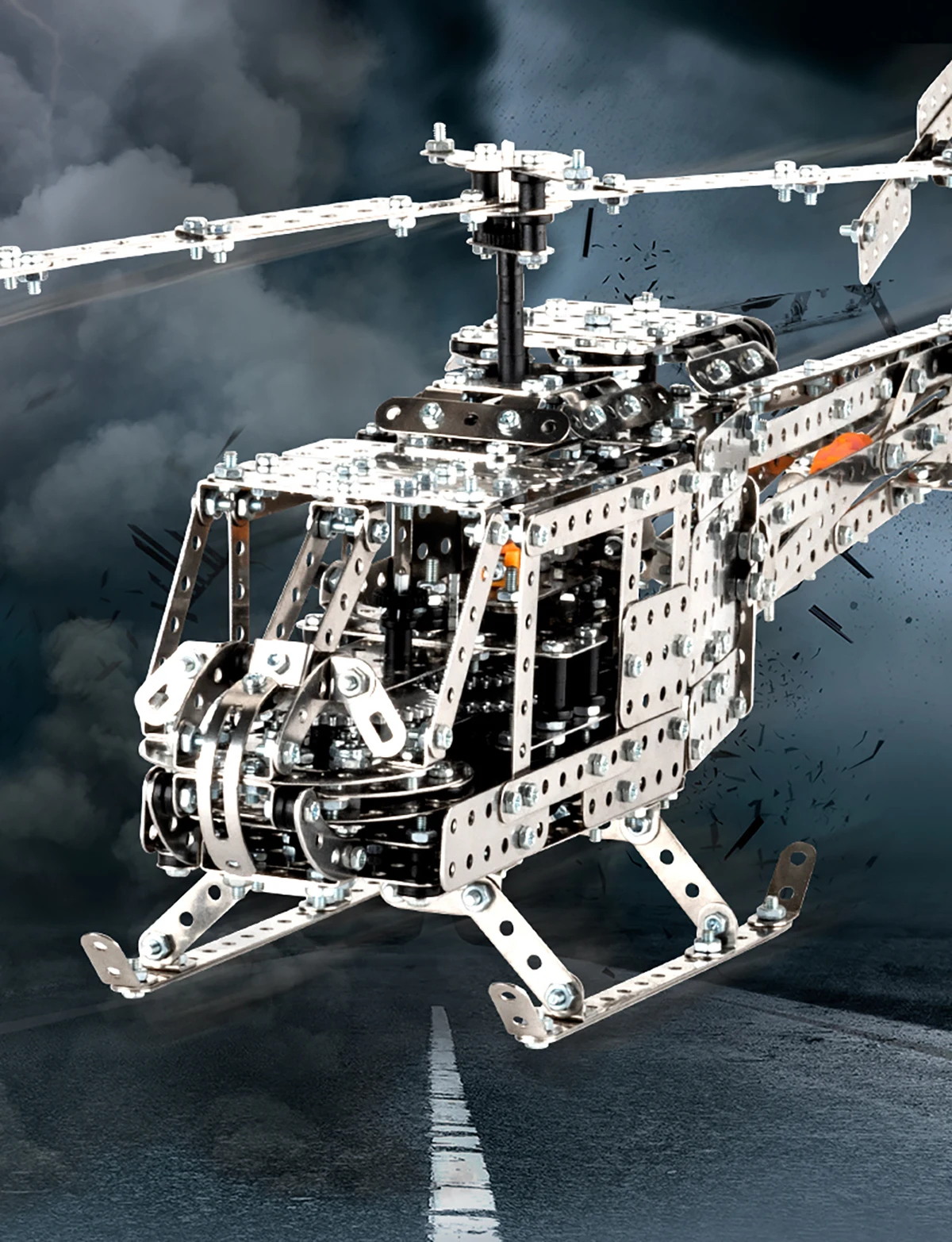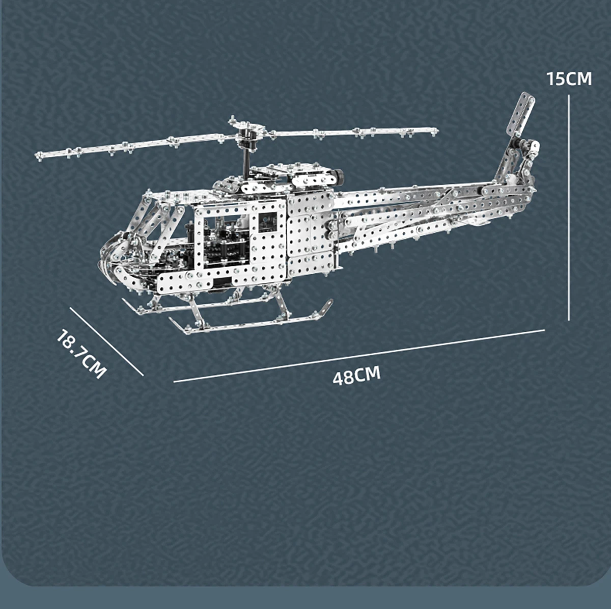 ¡Qué juguete tan bueno! Los elementos planos están bien pulidos, prácticamente no tienen rebabas ni bordes afilados. En las piezas en forma de L o dobladas, sin embargo, el desbarbado no está presente, por lo que se debe tener más cuidado al manipularlas. Los pernos son Torx, lo cual es muy conveniente porque funcionan mucho mejor que las llaves Allen en este tamaño compacto. La llave se mantuvo funcional en todo momento. El diseño es en su mayoría el mismo, pero hay muchos detalles que difieren en el producto en comparación con las imágenes de la tienda. El ensamblaje del rotor es muy diferente; la conexión del brazo trasero está fijada de manera distinta, la cola tiene elementos distintos, y el marco interior de la ventana de la cabina no está conectado al techo, a diferencia de lo que muestran las imágenes. Los engranajes son de aluminio y no están bien asegurados en los ejes. Creo que se podrían haber utilizado algunas piezas de plástico para solucionarlo, pero una vez que se completa la construcción, simplemente no es posible desmontar el sistema para implementar esos cambios. Esto significa que el accionamiento funciona de manera intermitente, sin poder girar realmente el rotor. Siempre se pega y se adhiere en algún lugar.