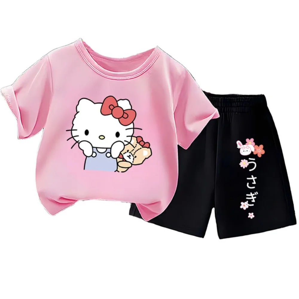 HELLO KITTY-Conjunto de dos piezas de camiseta y pantalones cortos con estampado para niños, Top informal transpirable para niñas, conjuntos de ropa para exteriores