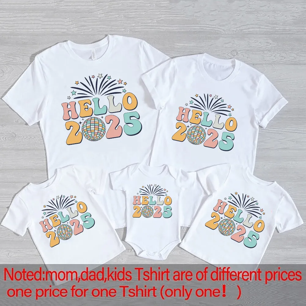 Comprar Hola 2025, Feliz Año Nuevo, ropa a juego para la familia, fiesta de Año Nuevo, papá, mamá, niños, camisas, pelele para bebé, traje de vacaciones familiar