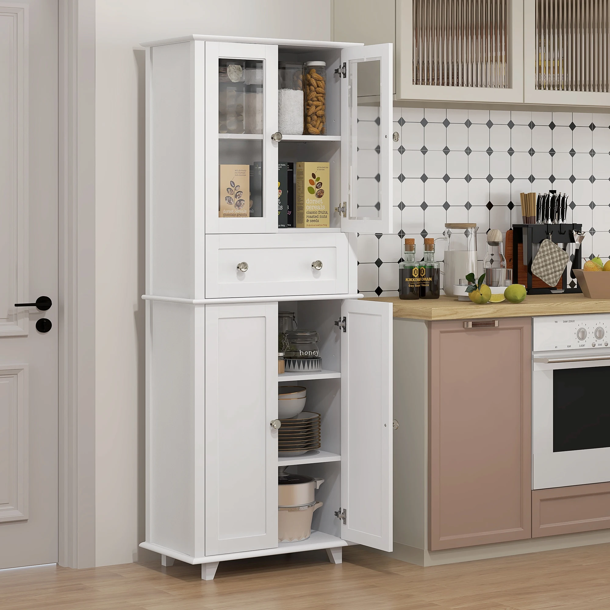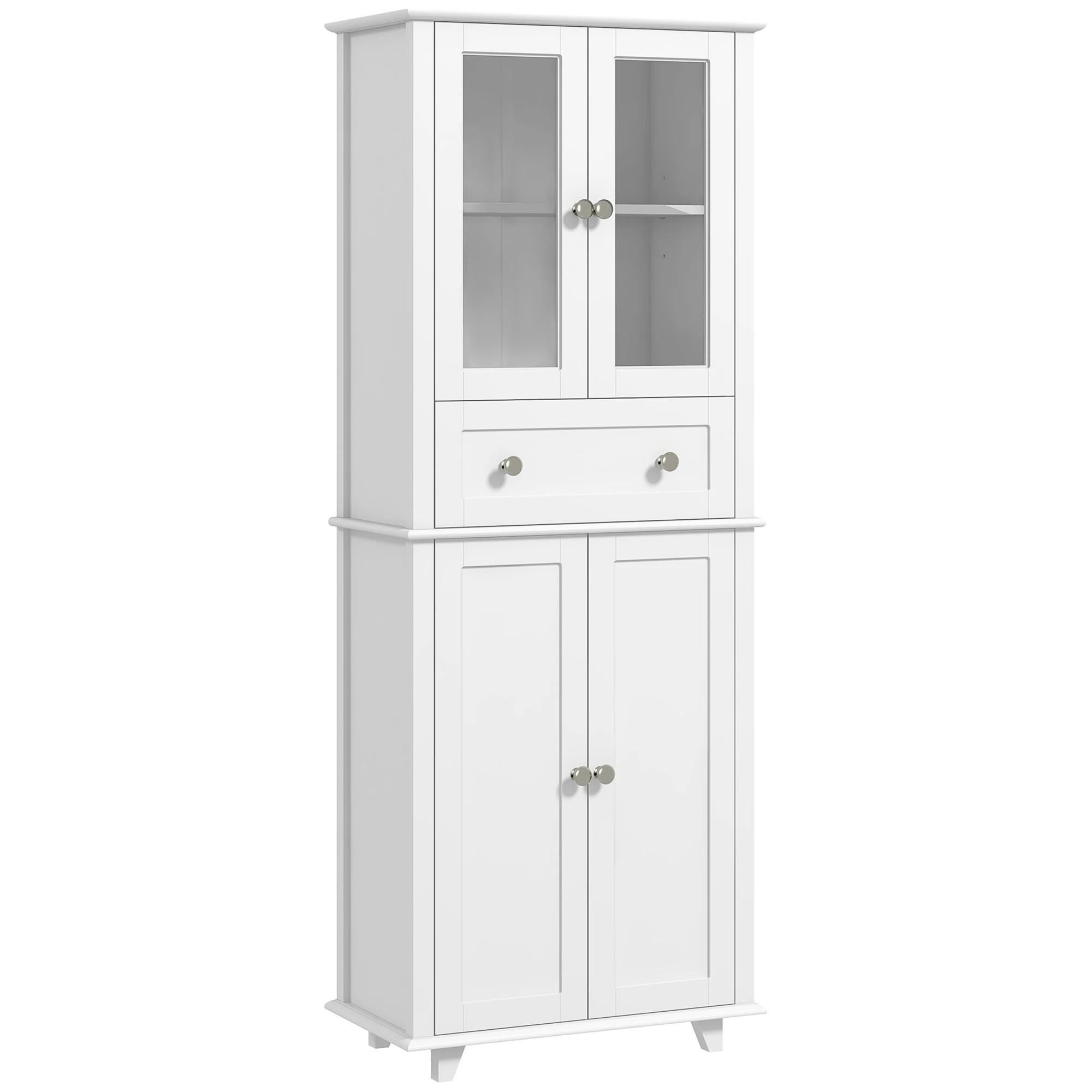 HOMCOM Alacena de Cocina Despensa Armario de Cocina con 2 Puertas de Vidrio Templado Cajón y Estantes Ajustables Aparador para Comedor 61x35x168,5 cm Blanco