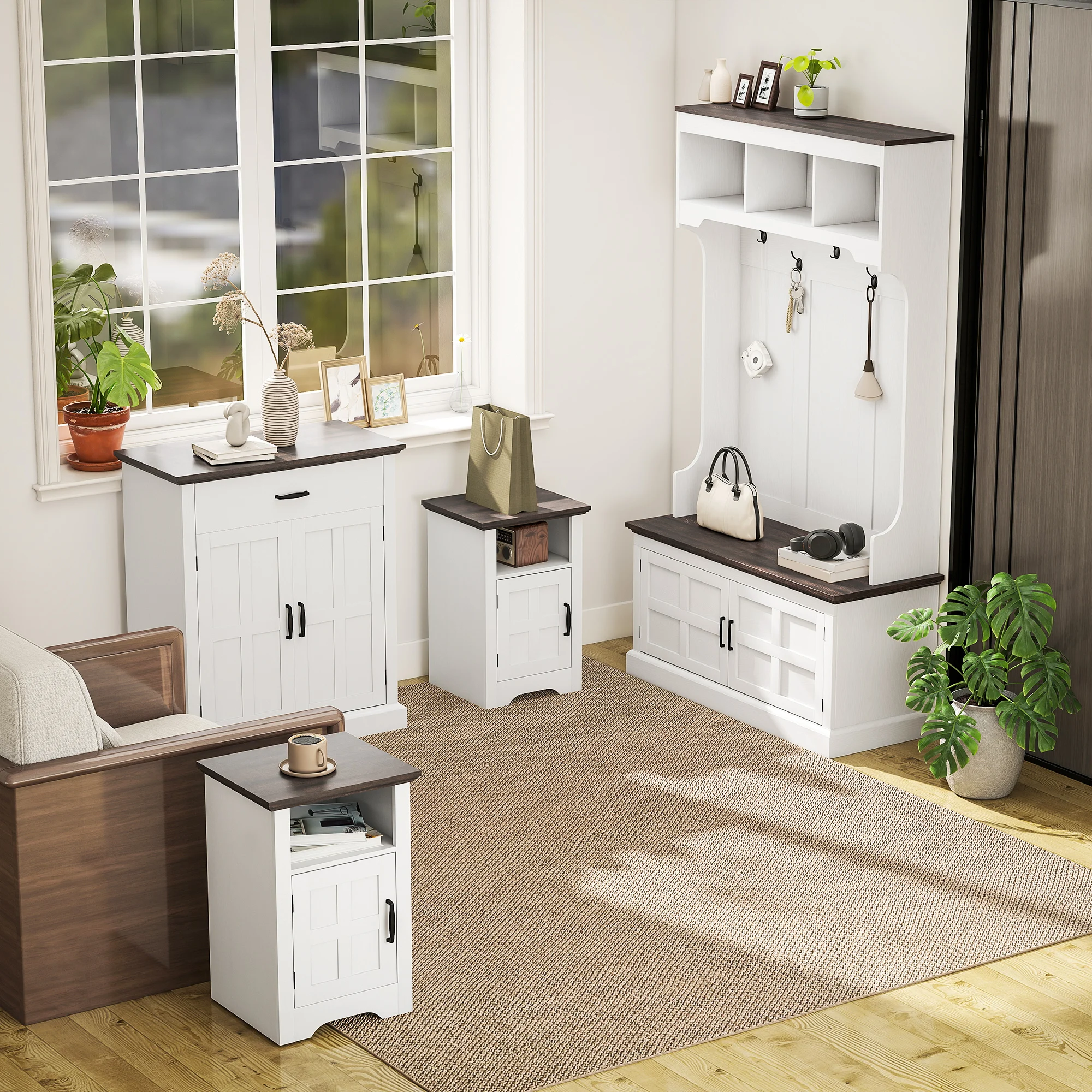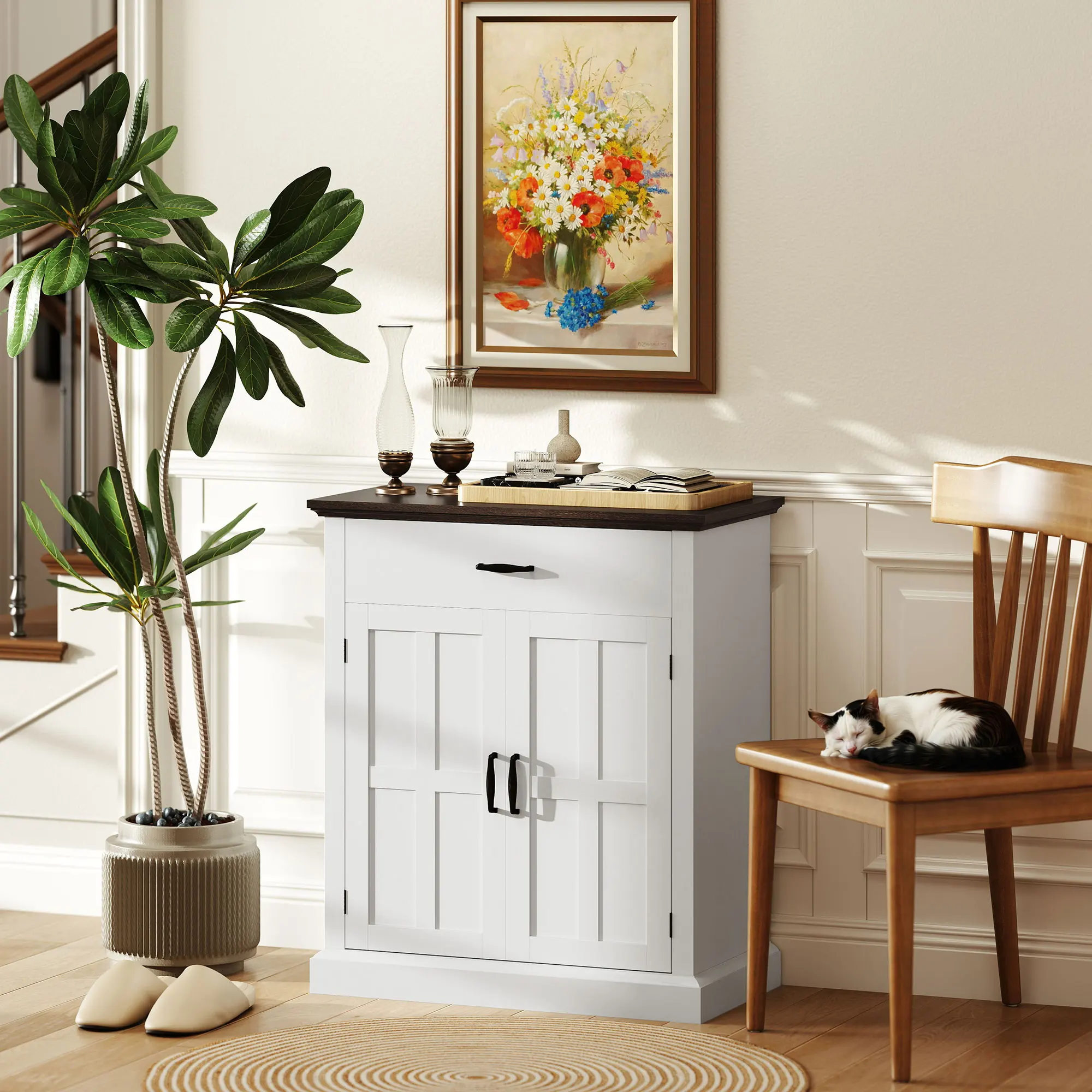 - Este mueble auxiliar de salón cuenta con un estante ajustable de tres niveles en el armario, proporcionando mayor flexibilidad para organizar tus artículos;
