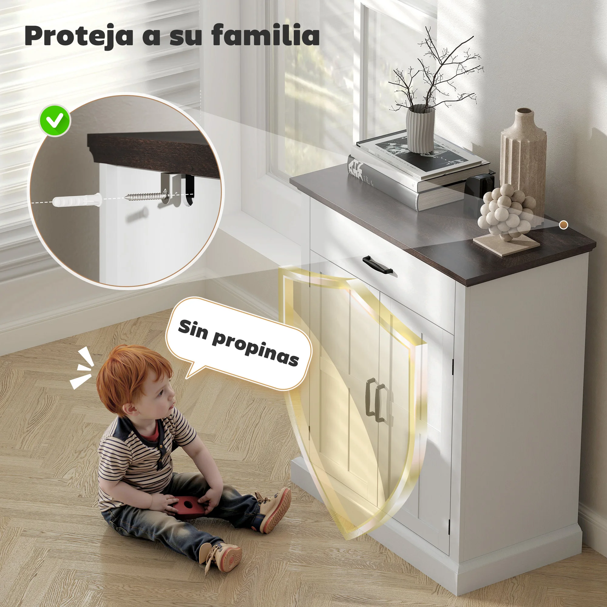 - Fabricado en MDF con una encimera de 3 cm de grosor, este aparador soporta hasta 46 kg, garantizando su resistencia;