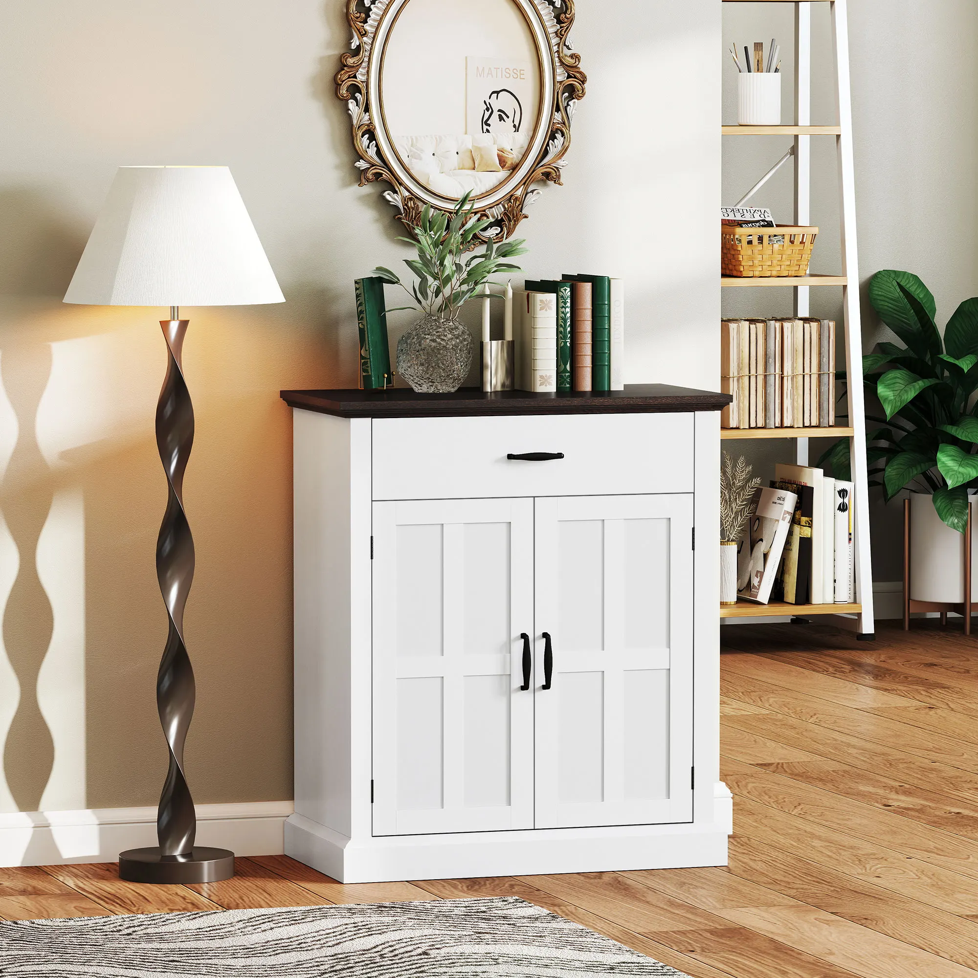 - Este mueble aparador ofrece un amplio espacio de almacenamiento con una gran superficie, un cajón y un armario de dos niveles;