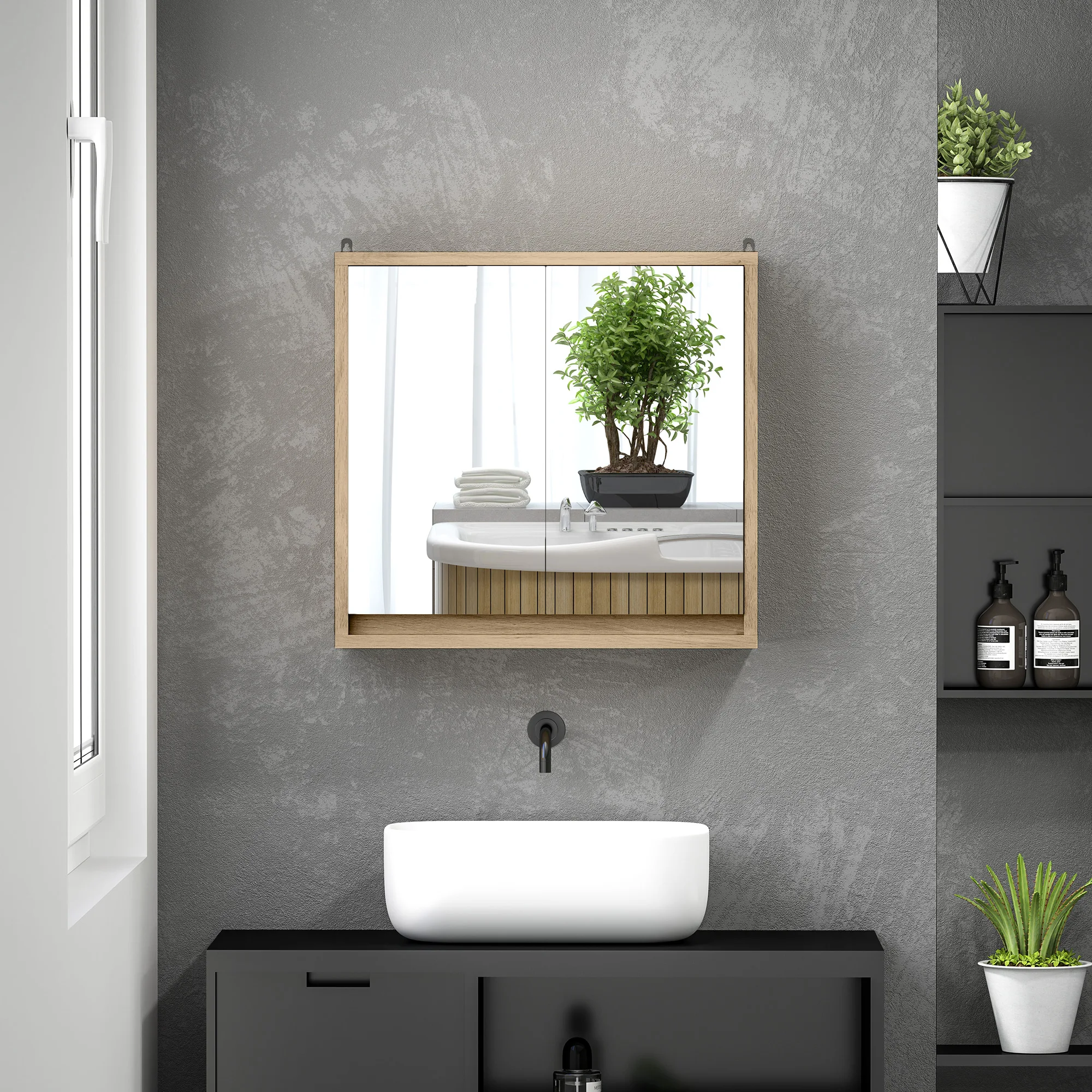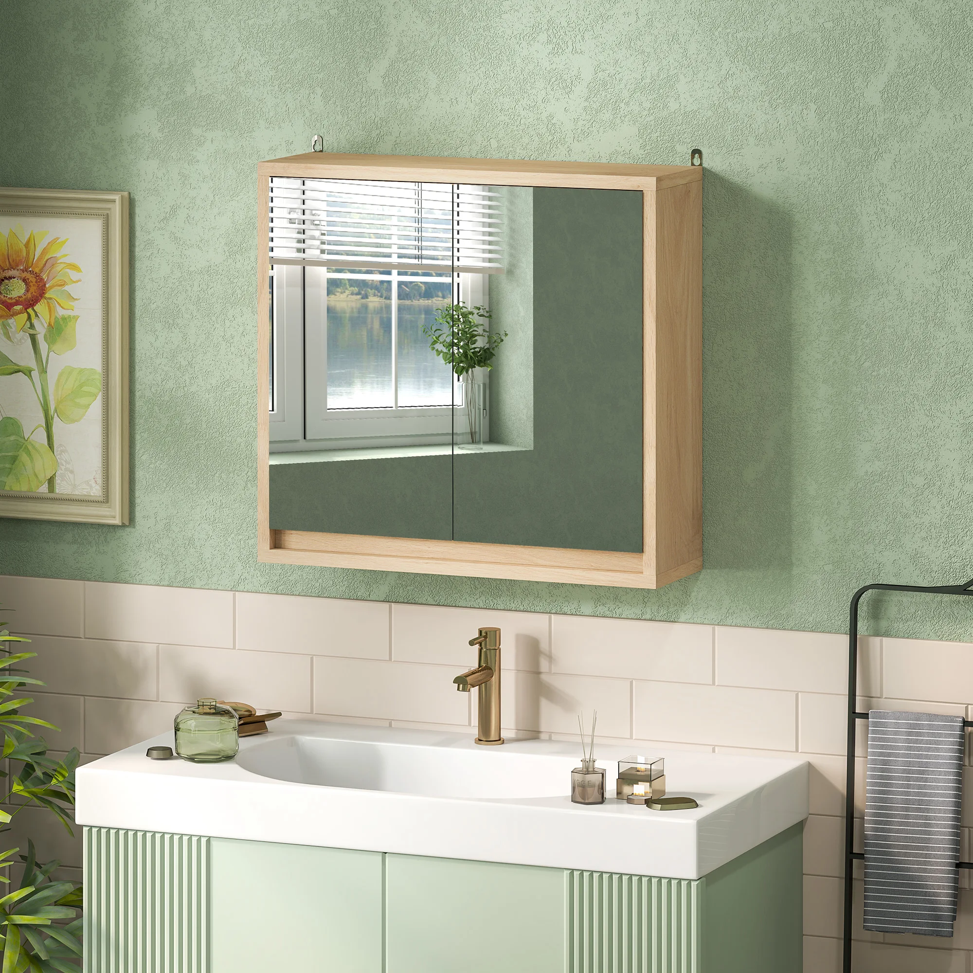 Este armario de pared con puerta de HOMCOM con doble puerta es perfecto para tener ordenados todos artículos de baño. Hecho de melamina de madera y MDF es resistente y de fácil mantenimiento. Las dos puertas con espejo facilitarán tus rutinas diarias de peinado, maquillaje, afeitado, etc. Incluye un estante interior regulable en altura para adaptar al tamaño de los productos que coloques. Al poder ir colgado en la pared, te permite aprovechar el espacio de tu baño.