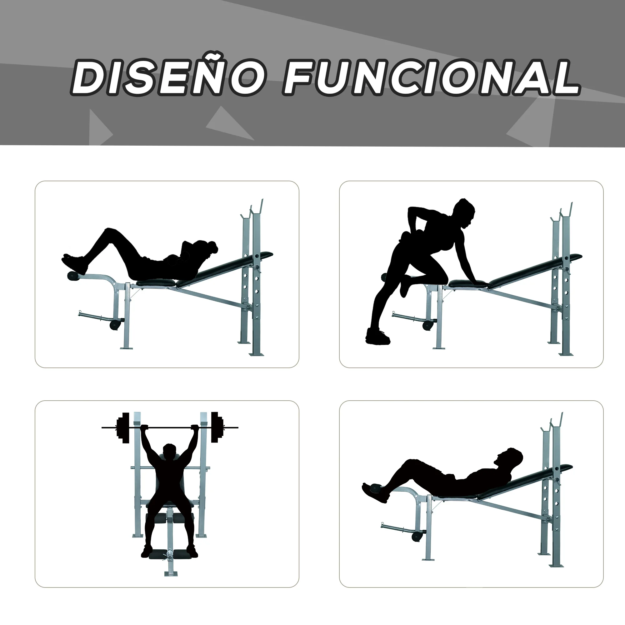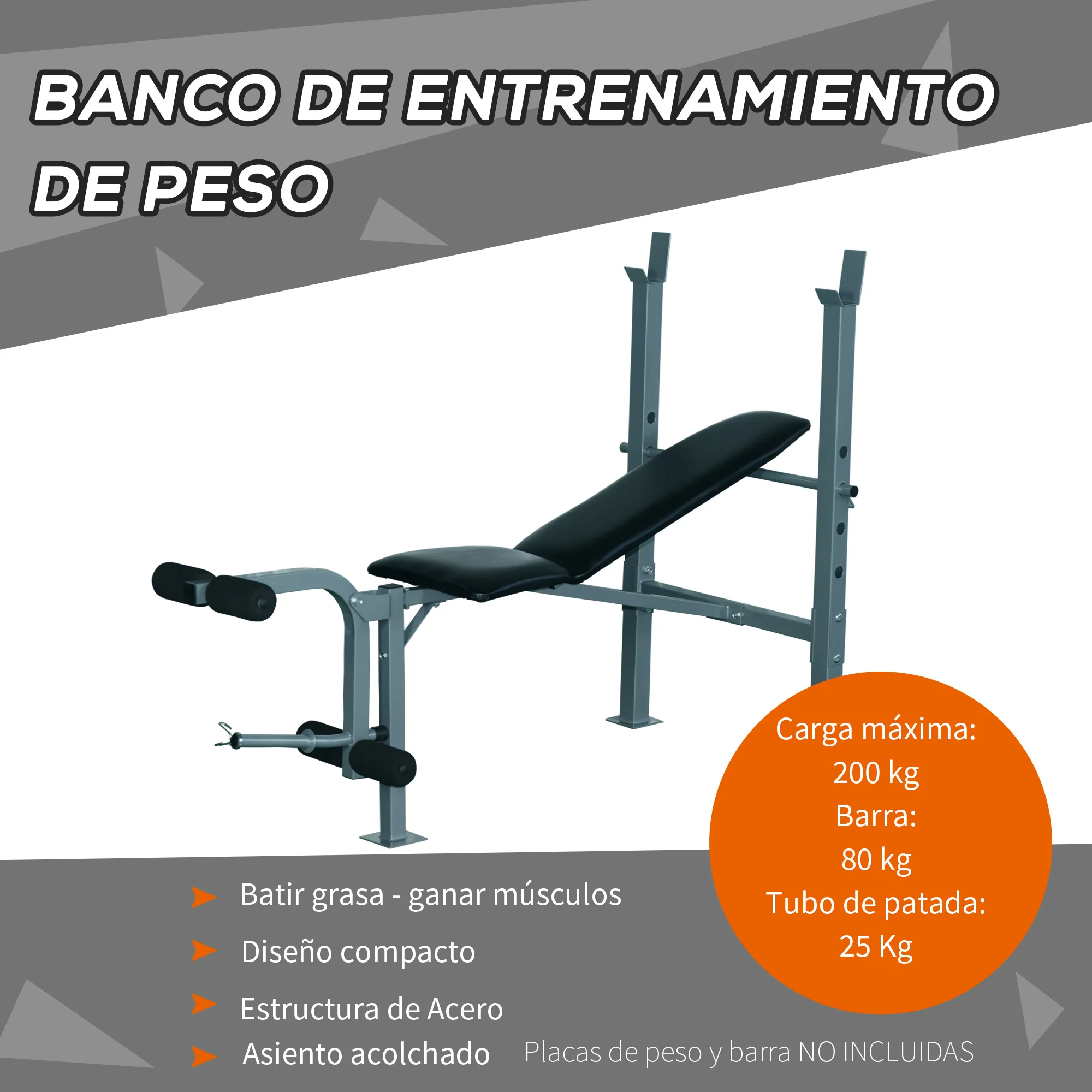 Las pesas no están incluidas.¿Buscas una máquina de fitness para entrenar todo el cuerpo? Este banco de pesas es perfecto para principiantes y profesionales, permite entrenar los músculos pectorales, deltoides, trapecio y también los músculos de las piernas. La superficie es de PVC resistente al agua y fácil de limpiar. El respaldo y el asiento están bien acolchados para trabajar con comodidad. La altura del respaldo es ajustable a 4 niveles para adaptar el entrenamiento a sus necesidades. Es un banco de pesas sencillo pero muy práctico para hacer ejercicios de musculación de pecho y piernas ¡Ponerte en forma está a tu alcance!
