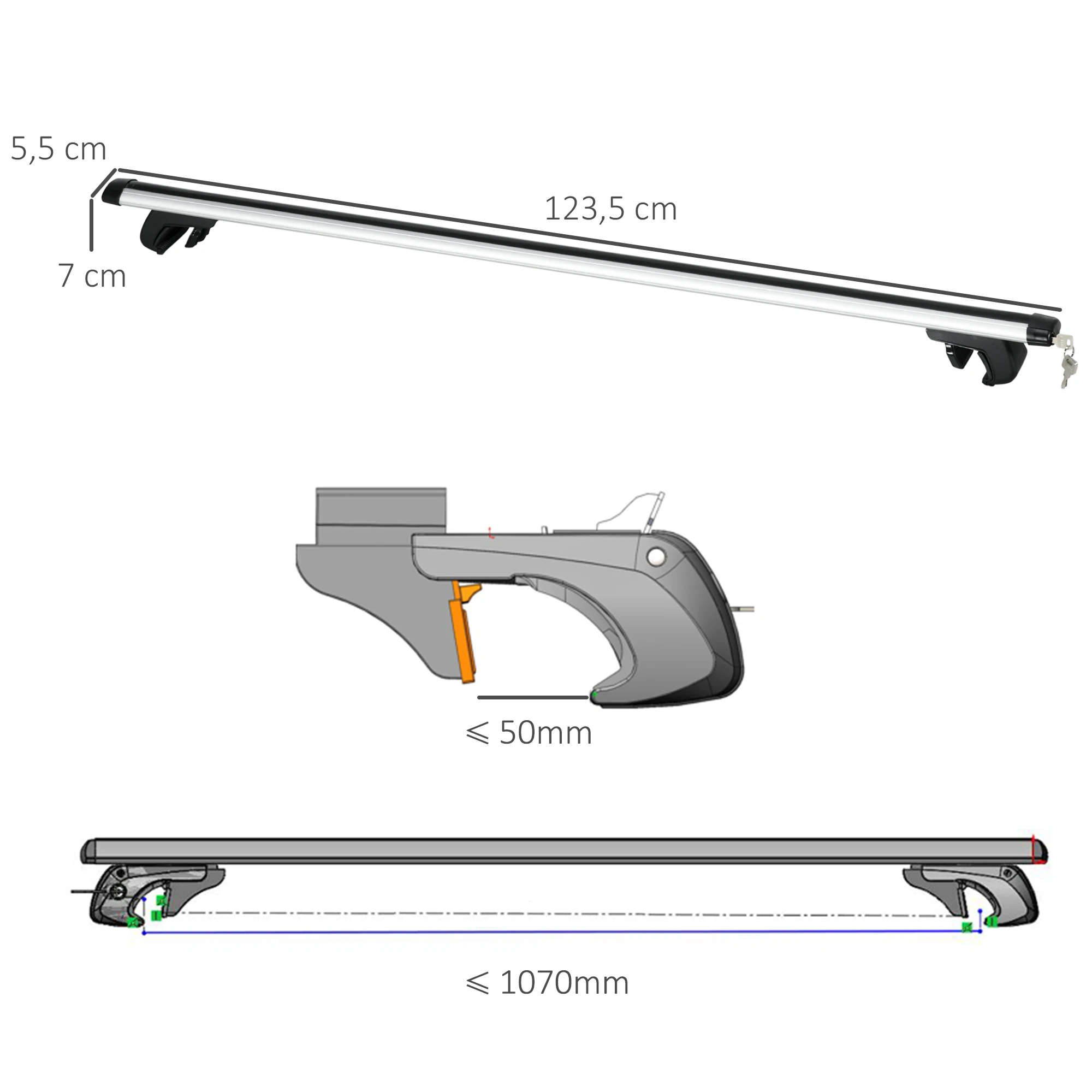 HOMCOM Barras de Techo Universales para Vehículos de Aluminio Bacas Portaequipajes Coche Automóvil Baca para Coche Universales con Cerradura Carga 75 kg 123,5 cm Plata