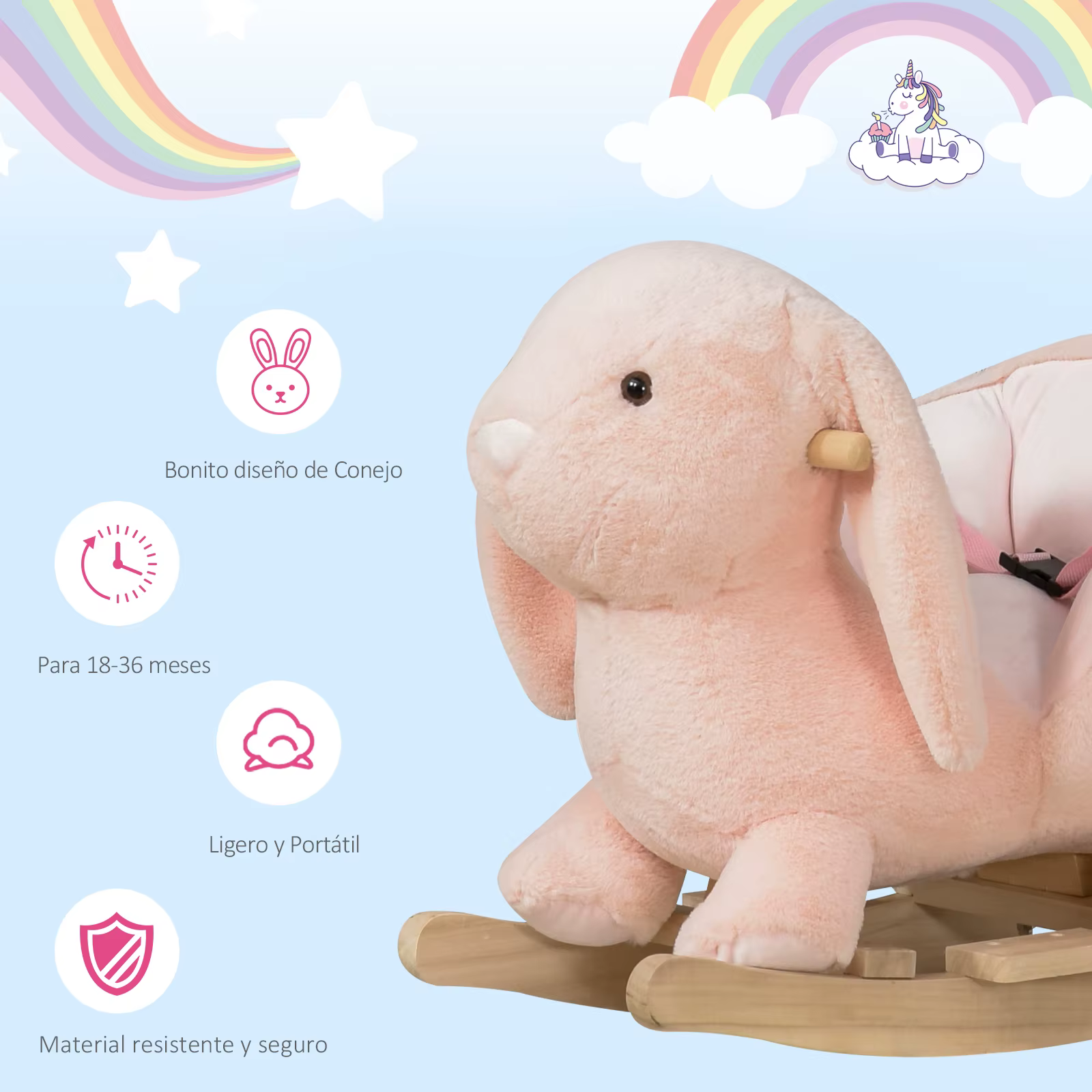 Este bonito balancín infantil de HOMCOM con forma de conejito es seguro, divertido y decorativo. Pensado para los más pequeños de la casa, tu peque podrá usarlo a partir de los 18 meses de forma cómoda y segura. Cuenta con un diseño envolvente con respaldo y laterales altos, cinturón de seguridad, apoyapiés y un manillar de fácil agarre. Al pulsar una de las orejas emitirá sonidos realistas. Su bonito diseño también es perfecto para decorar o tematizar la habitación de los niños.