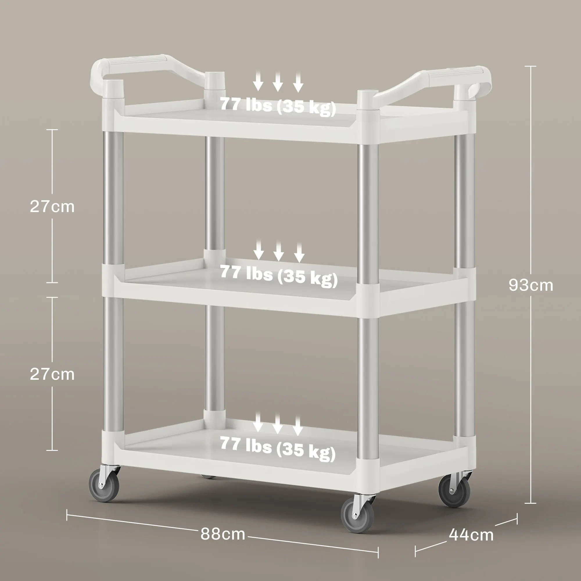 Este carrito auxiliar con ruedas de HOMCOM es ideal para tu cocina. Es perfecto para almacenar fruta, verdura y aperitivos, así como para servir comida y bebida en restaurantes y cafeterías. También es una excelente opción como carro de limpieza en hoteles. Equipado con tres espaciosos estantes y cuatro ruedas que se mueven silenciosamente, lo que facilita su desplazamiento. Fabricado en aleación de aluminio de alta calidad, es resistente a la corrosión y garantiza su durabilidad.