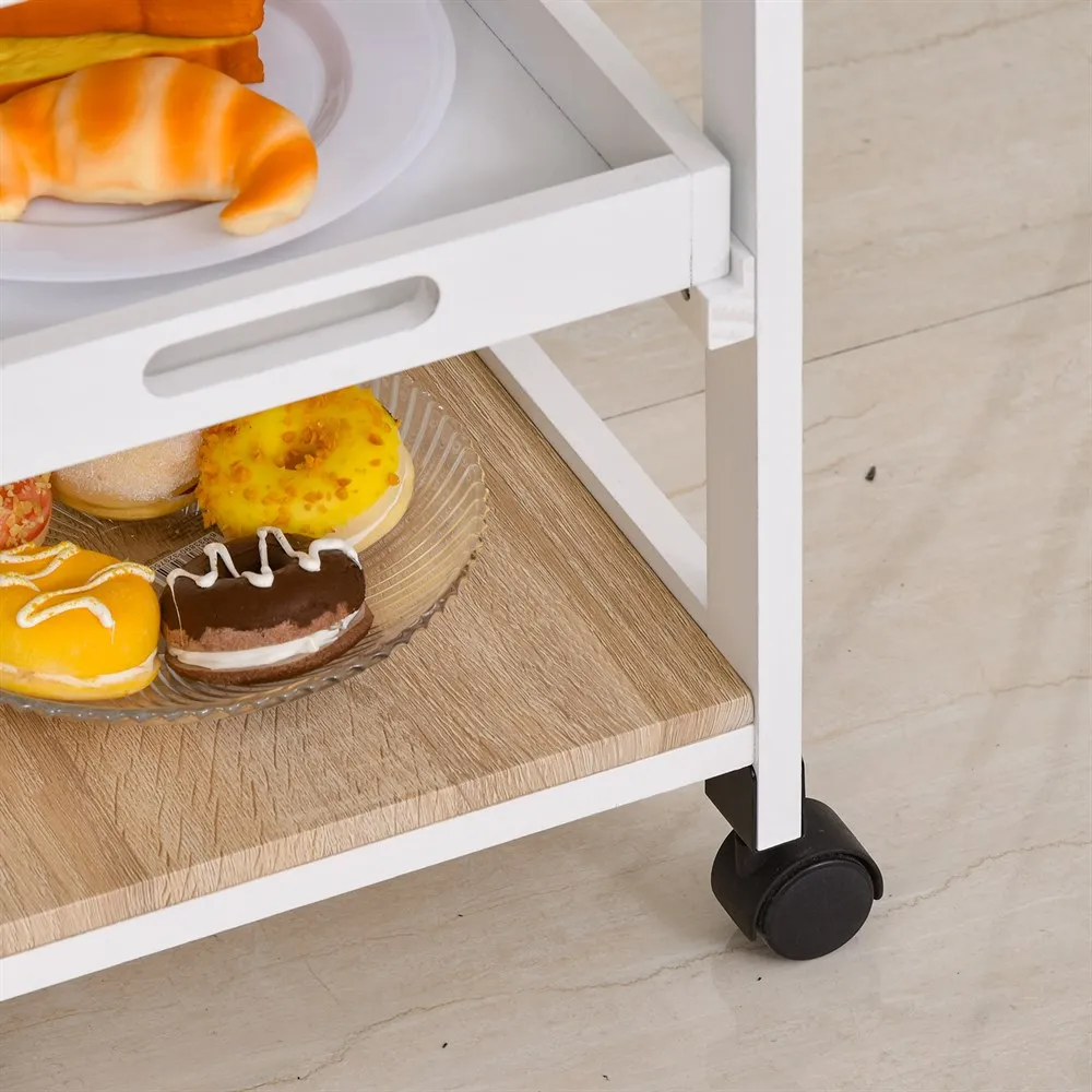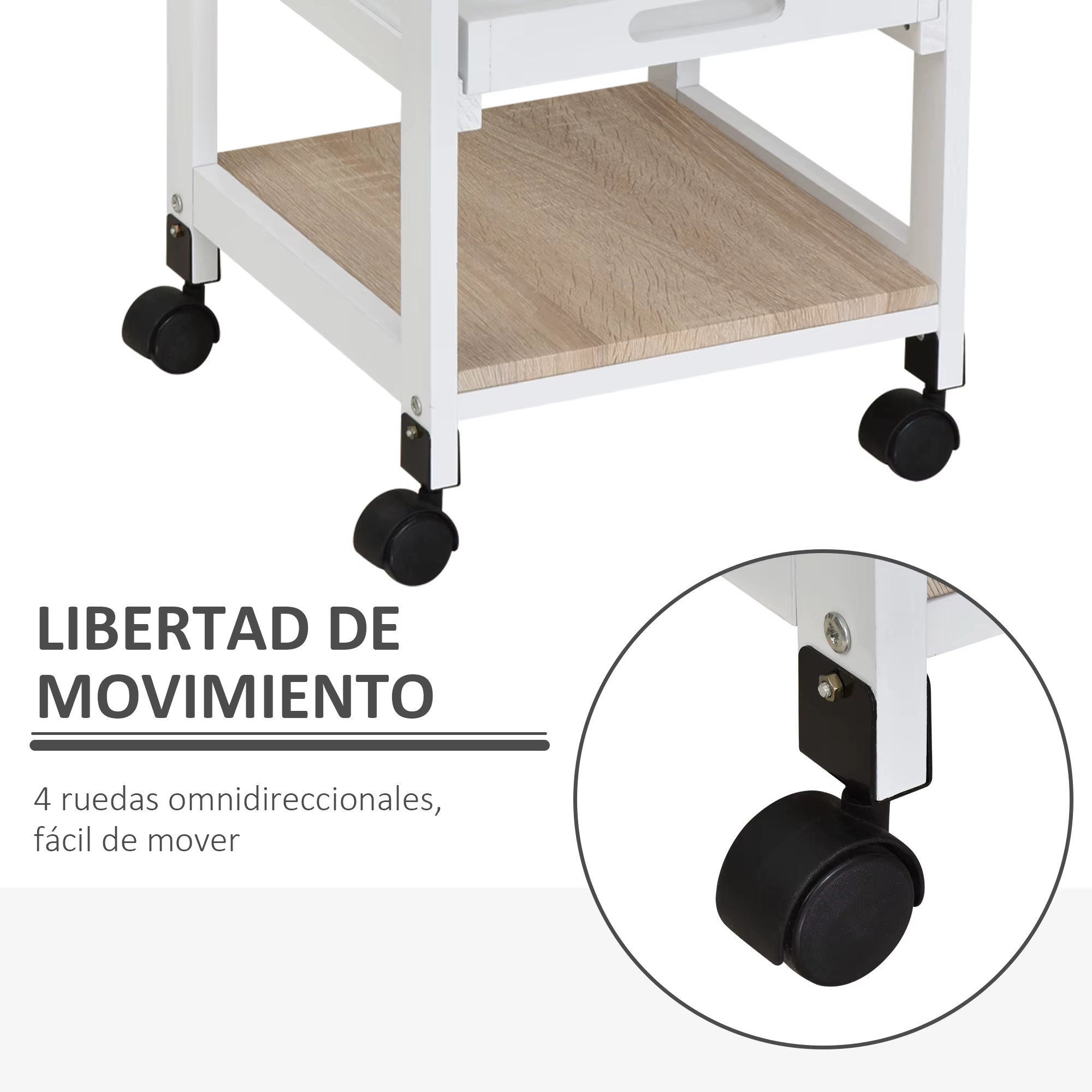 Una cocina ordenada te ayuda a mantener tu mente equilibrada. Gracias a este carrito de servicio de cocina con ruedas tan versátil y de estilo natural que te presenta HOMCOM, ordenar tu cocina te será mucho más sencillo. Se compone de varios elementos para que almacenes alimentos y enseres de cocina como son: botellero, bandeja extraíble, estante y cajón. Gracias a sus ruedas lo puedes mover para utilizarlo donde quieras y cuando acabes puedes volverlo a colocar en su lugar cómodamente. Deja que este carrito de servicio de cocina con ruedas te ayude a organizar tu casa.