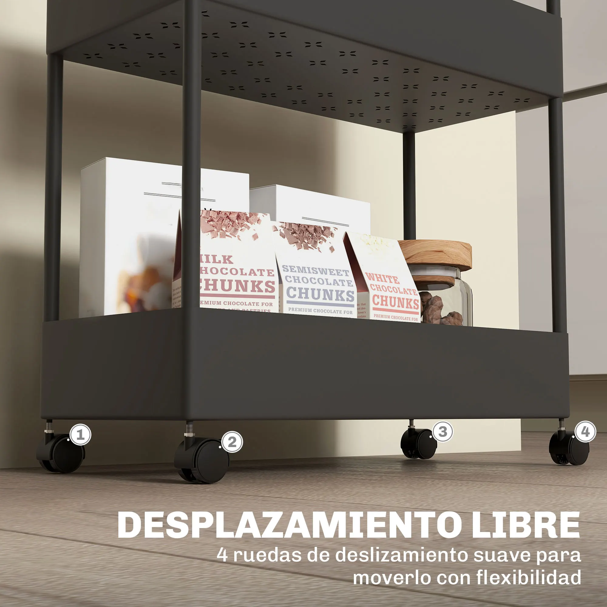 Este carrito auxiliar con ruedas compacto de HOMCOM es ideal para espacios pequeños que necesitan más almacenamiento. Los 4 compartimentos abiertos y 4 ganchos extraíbles ofrecen un amplio espacio para tus diversos suministros y accesorios. Cuenta con 4 ruedas, 2 de ellas con freno para facilitar su movimiento. Es ideal para usar como carrito auxiliar para manualidades, carrito de cocina, carrito de baño, carrito de almacenamiento en la oficina y mucho más.