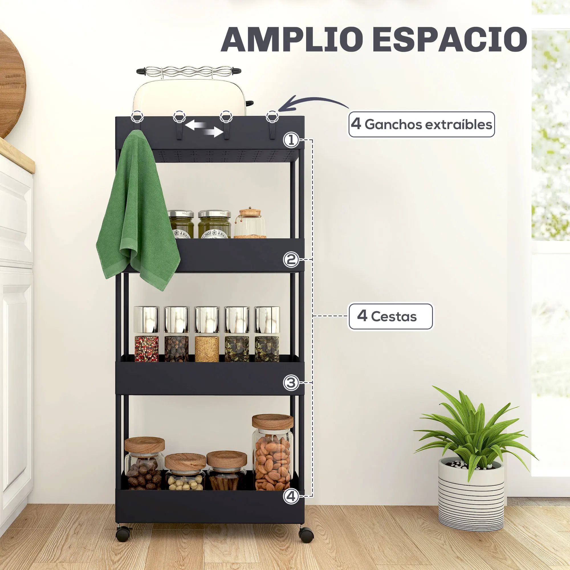 ● Este carro de cocina de almacenamiento tiene 4 ruedas, 2 de ellas con frenos para facilitar el transporte de un espacio a otro