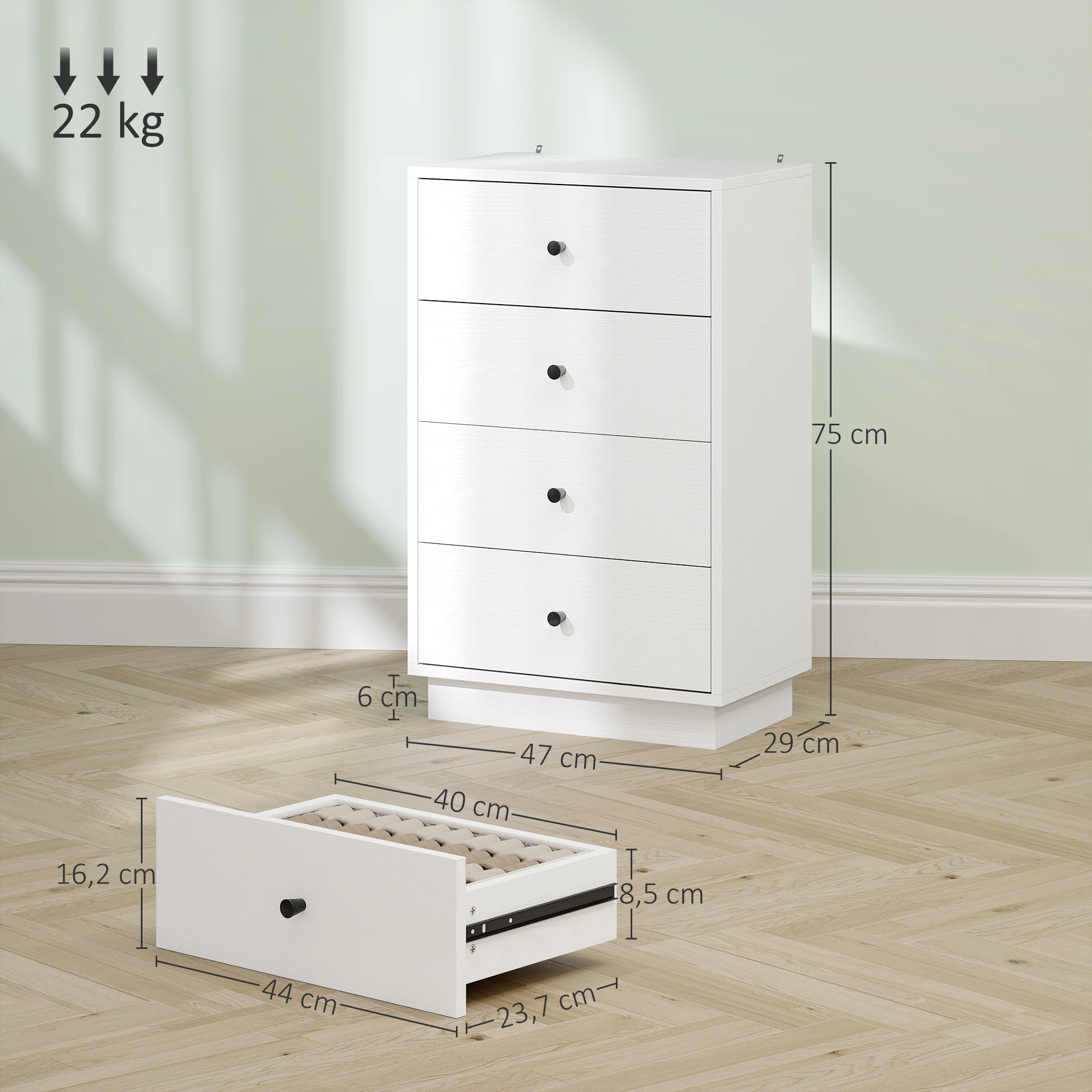 ● Carga máxima: 22 kg (total), 10 kg (encimera) y 3 kg (cada cajón)