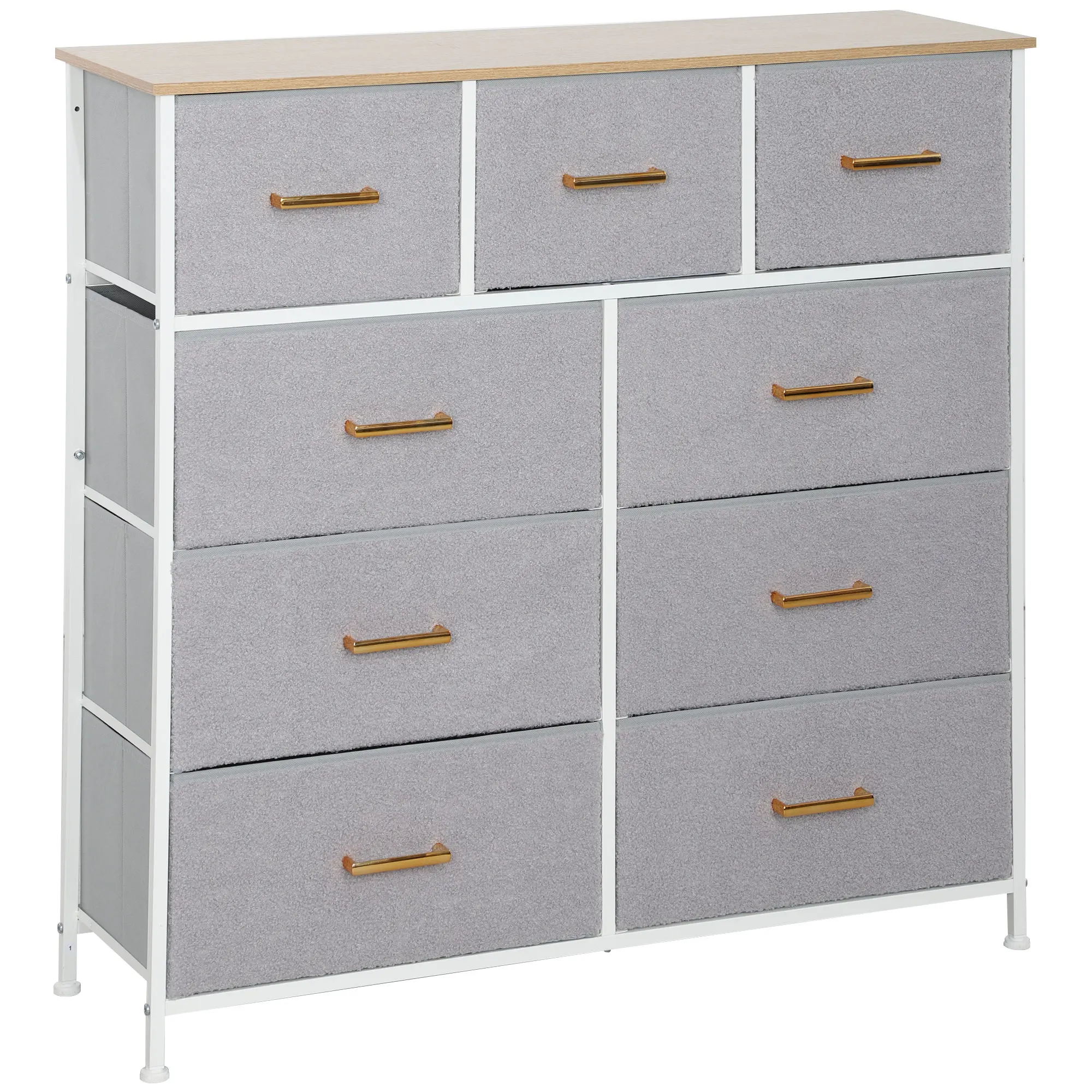 Organiza tu dormitorio con esta cómoda de cajones, ideal para cualquier ambiente. Con nueve cajones en tejido de borreguillo y tiradores dorados, ofrece amplio espacio para tus objetos esenciales. Con las patas ajustables, esta cómoda proporciona mayor estabilidad, incluso en suelos irregulares, lo que la convierte en la opción perfecta para tu dormitorio, pasillo o salón.