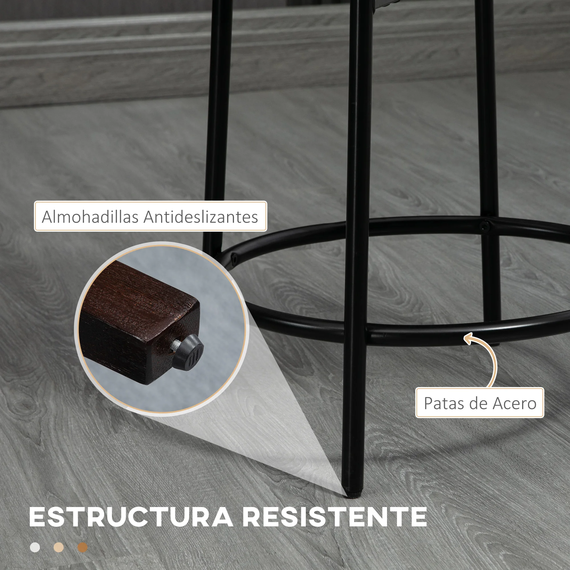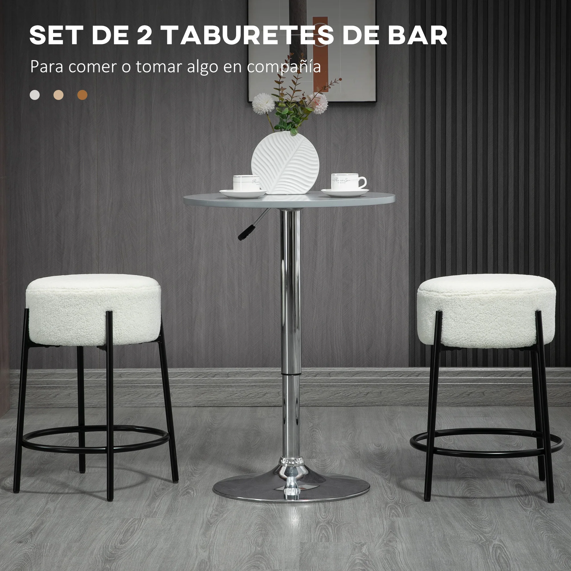 Características:● Set de 2 taburetes de bar con un diseño refinado y atemporal que realza el encanto de cualquier ambiente ● El tapizado en borreguito sintético y la estructura de acero negro ofrecen un aspecto elegante y auténtico ● Tamaño compacto, adecuado para instalación en un bar, cocina, cafetería u otros lugares similares ● Reposapiés incorporados para mayor comodidad ● Asientos acolchados con espuma de 4 cm de grosor ● Estas sillas altas para barra son ideales tanto para una isla de cocina como para un rincón del salón o una habitación adicional ● Son aptos para mesas de altura de 89 a 99 cm de altura ● Patas con almohadillas ajustables para mayor estabilidad y protección del suelo ● Se requiere montaje