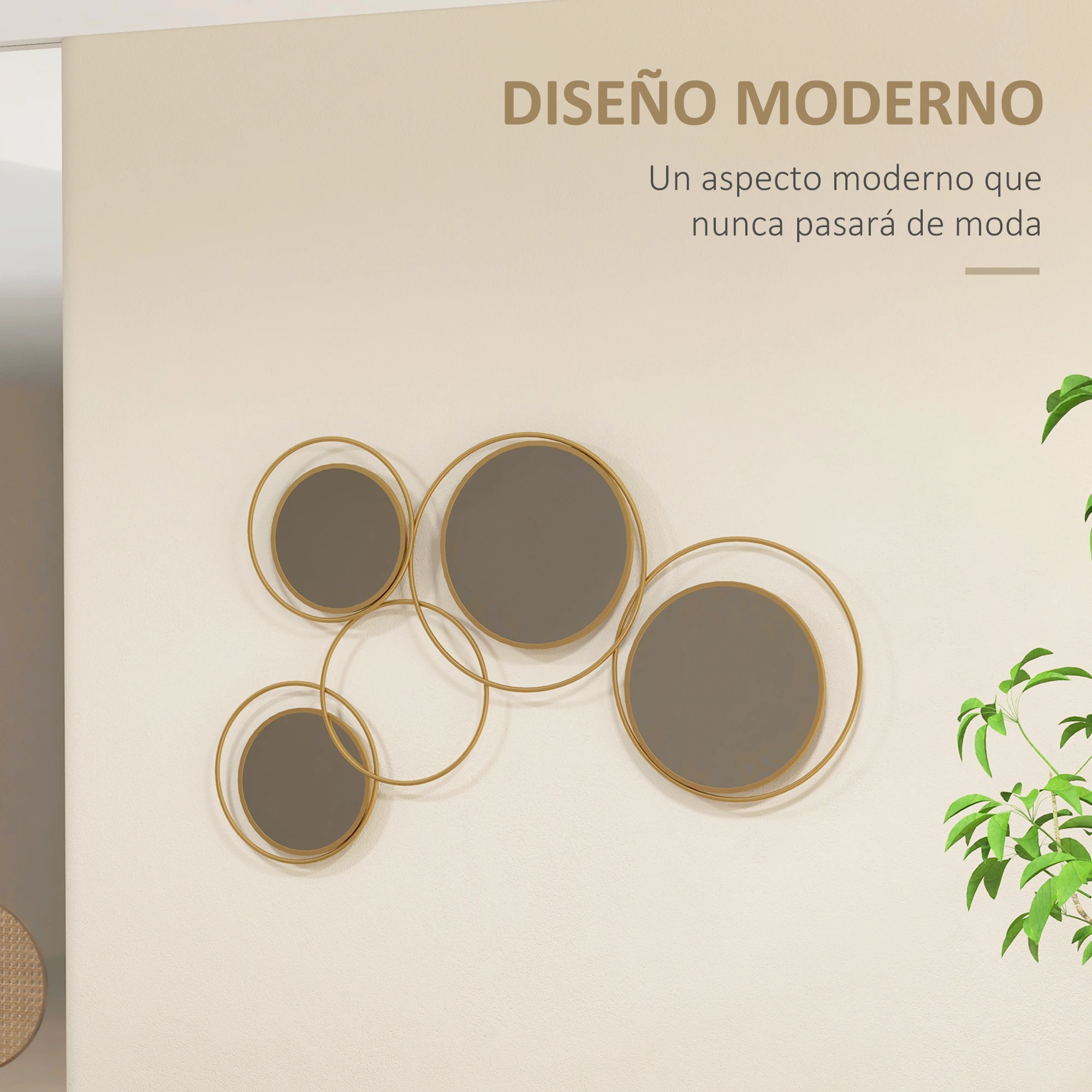 ¿Quieres decorar tu hogar? Nuestros espejos decorativos de pared de HOMCOM son lo que necesitas. También pueden ser un regalo ideal para la inauguración de una casa, bodas, cumpleaños, etc. Con un diseño exclusivo con bonitos círculos de color dorado rodeando los 4 espejos, este espejo decorativo de pared le dará un toque de elegancia y modernidad a tu hogar u oficina a la vez que aportará mayor luminosidad a tu espacio. Además, es muy fácil de instalar y viene con accesorios incluidos.