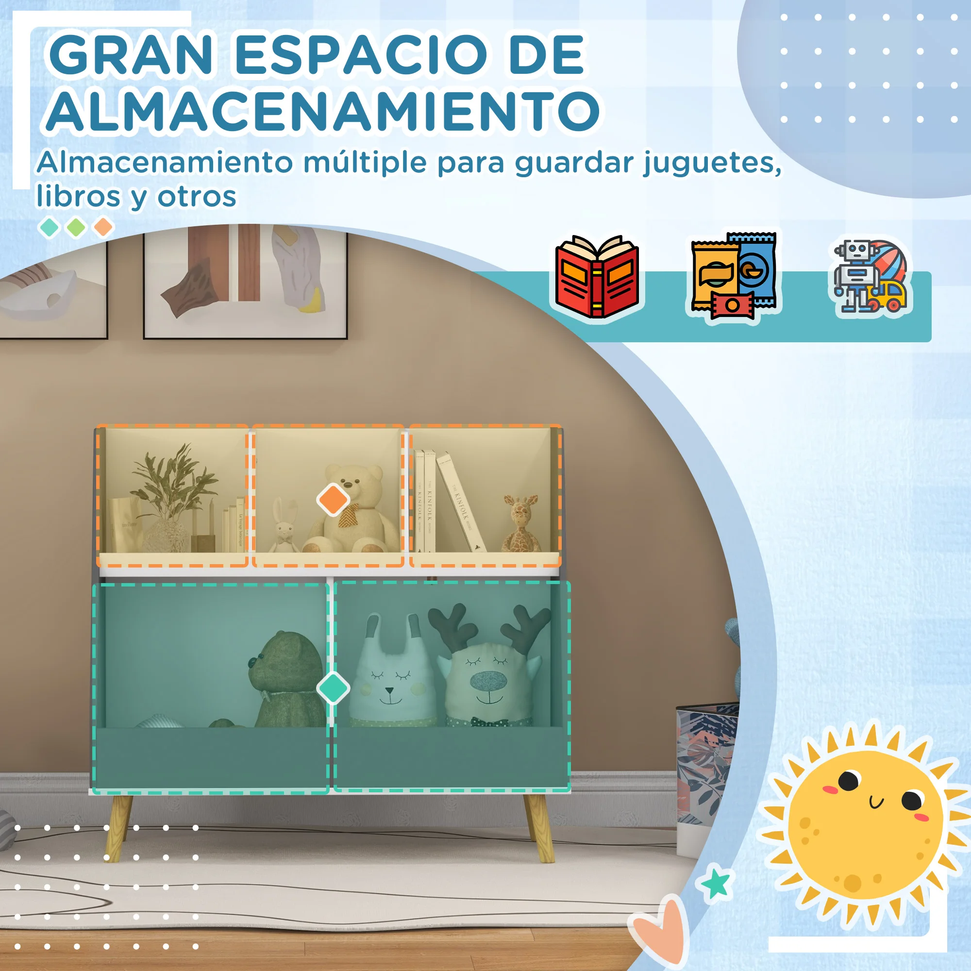 Este organizador infantil de HOMCOM es la solución perfecta para mantener ordenados los juguetes y libros de tus hijos. Con sus 5 compartimentos distribuidos en 2 alturas, se adapta a cualquier espacio, ya sea una guardería, sala de juegos, sala de estar o aula. Su diseño abierto facilita el uso por parte de los niños, permitiéndoles mantener todo a la vista y acceder directamente a los artículos.