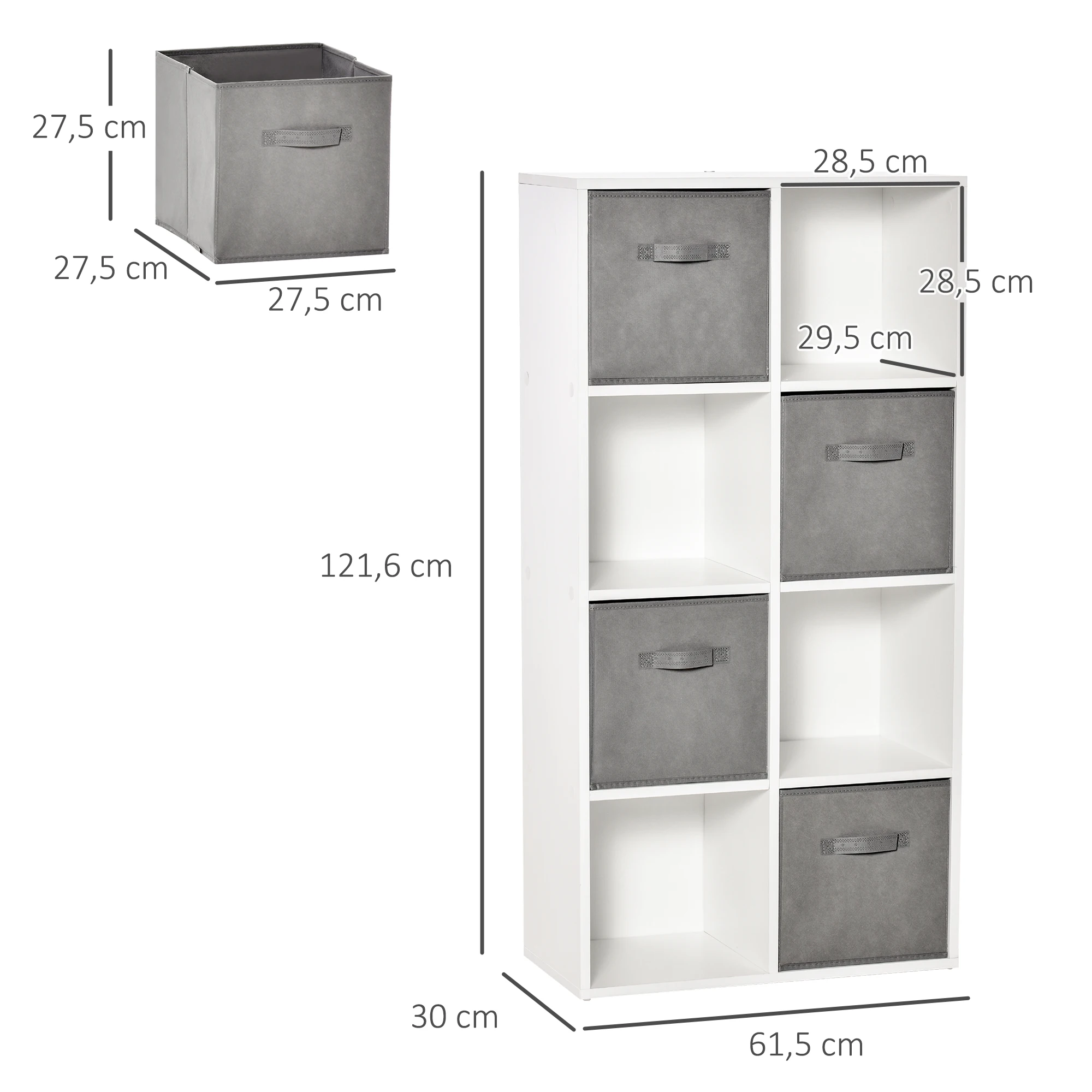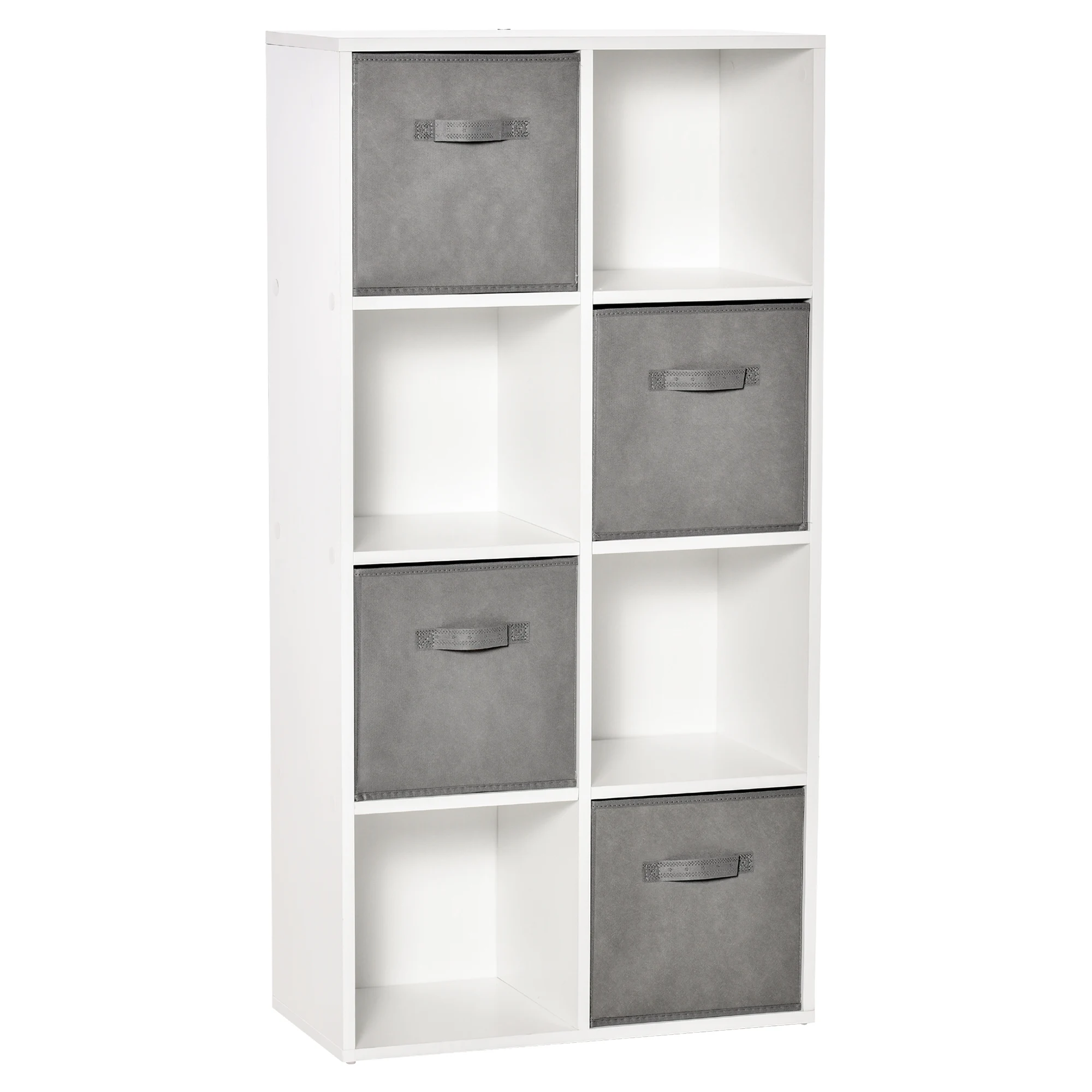 Si buscas una estantería práctica y funcional, esta unidad de almacenaje con 8 compartimentos en forma de cubos de HOMCOM es ideal. Proporciona un amplio espacio de almacenamiento y podrás tener organizados todos tus libros, ropa u otros objetos que desees colocar. Equipada con 4 cajones extraíbles de tela no tejida, te permite personalizarla según tus necesidades. El acabado en blanco y las cajas de color gris aportarán un toque de modernidad y elegancia a tu casa.